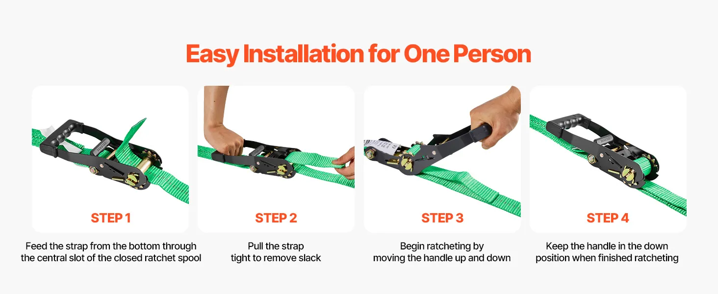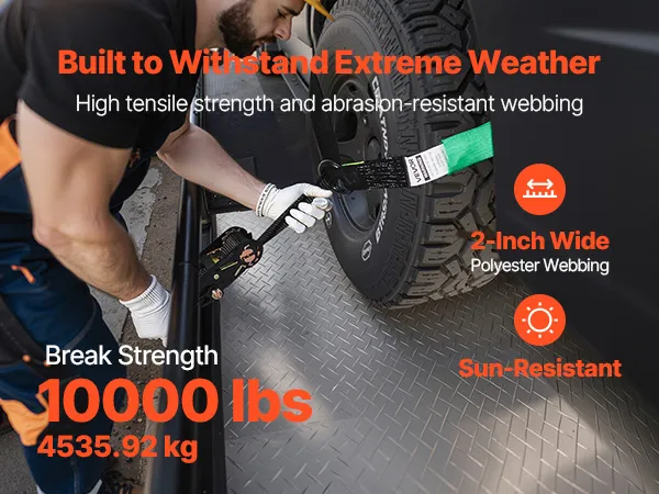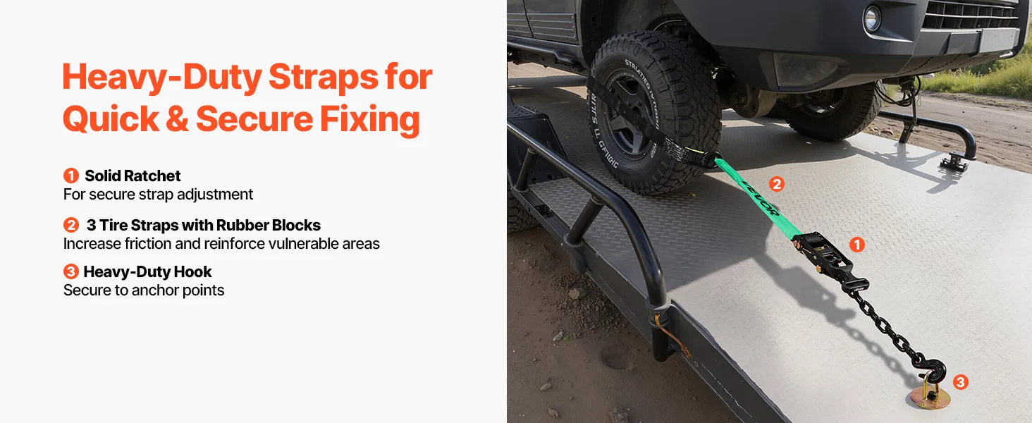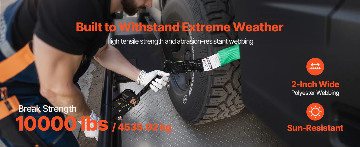 Strong Load Capacity: Built with high-strength webbing, this ratchet strap supports up to 3333 lbs/1512 kg of load capacity and 10009 lbs/4540 kg of tensile strength. Designed for maximum durability, it ensures reliable and secure transport of heavy vehicles without risk of loosening or snapping