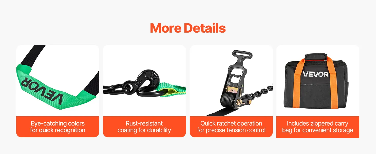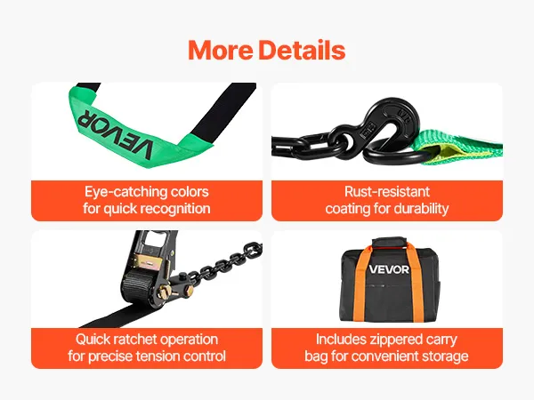 Featuring an eye-catching bright color design, this car tie down strap is easy to see and operate. The rust-resistant surface ensures durability, while the zipper storage bag is portable and easy to store for reliable use.