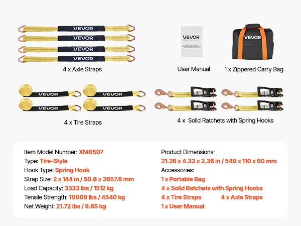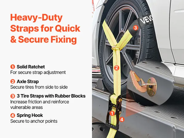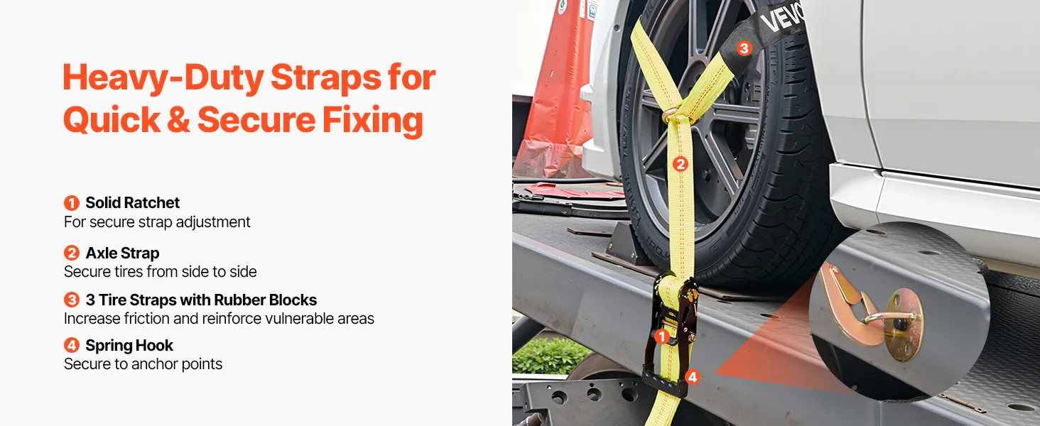 Tire-Friendly Design: Featuring soft materials and rubber blocks that directly touch the tire, our ratchet strap minimizes friction and pressure, ensuring your tires and rims remain undamaged during transport. The kit includes two sets of solid ratchets and 144-inch/3658mm straps