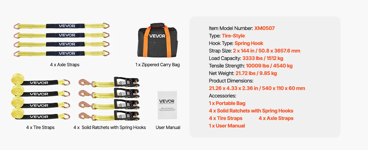VEVOR Wheel Chock Tie-Down Kit, Tire-Style Trailer Tie Down Strap, Car Tie Down Kit with Spring Hook, Break Strength 4540 kg & Working Load 1512 kg Motorcycle Tie-Down System for ATV, SUV, Trailer
