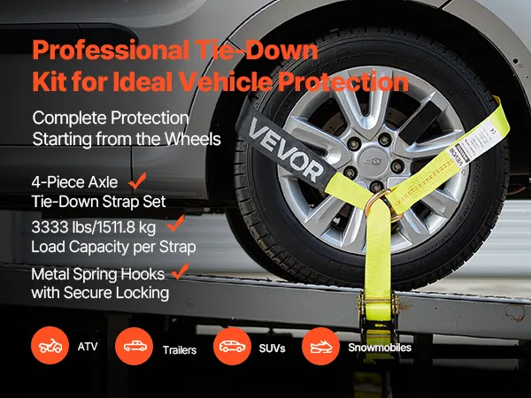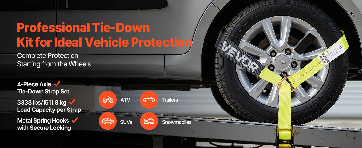 Our wheel tie-down kit provides a quick and simple tire fixing configuration, which can be fixed directly around the tire. Each strap supports up to 3333 lbs/1512 kg, keeping your vehicle in place while being transported or parked.