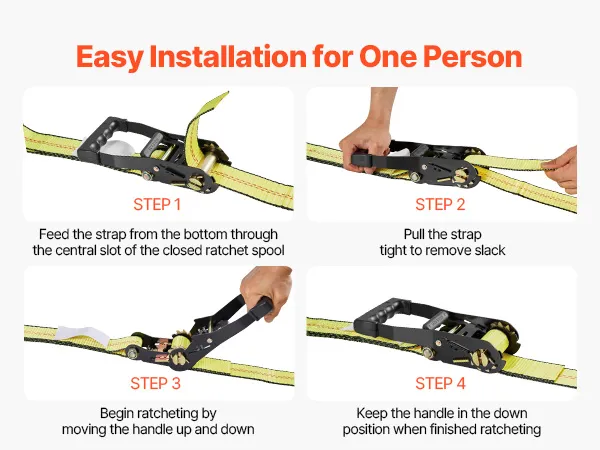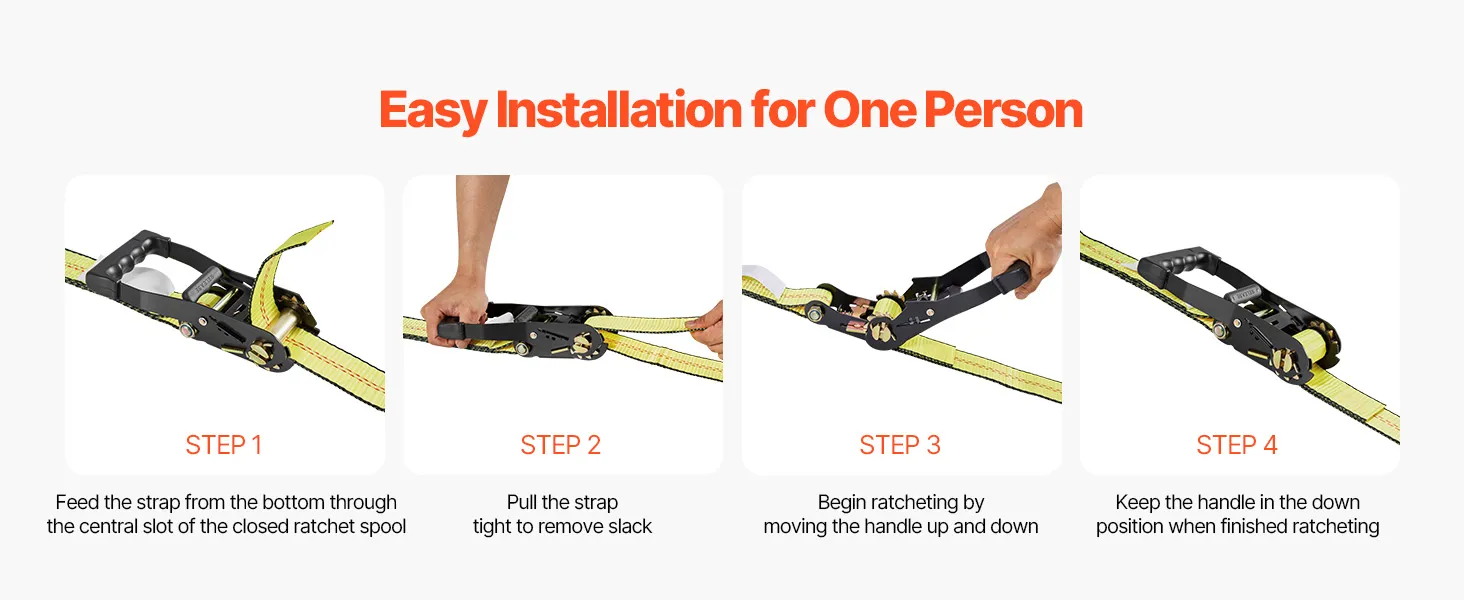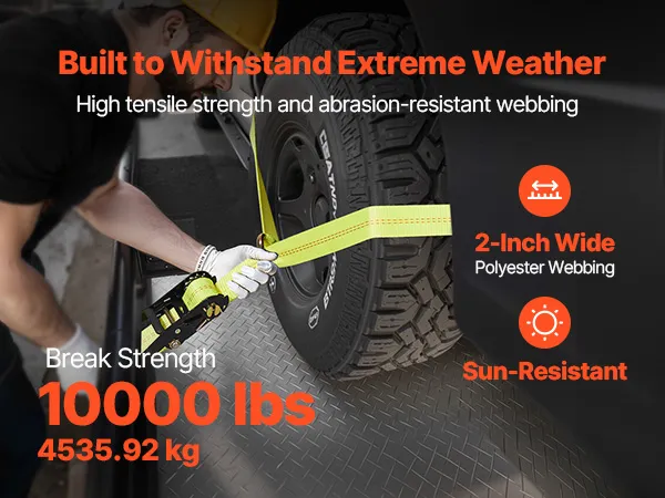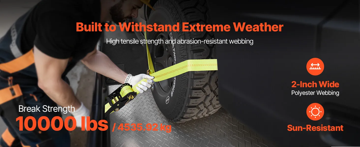 Strong Load Capacity: Built with high-strength webbing, this ratchet strap supports up to 3333 lbs/1512 kg of load capacity and 10009 lbs/4540 kg of tensile strength. Designed for high durability, it ensures reliable and secure transport of heavy vehicles without risk of loosening or snapping