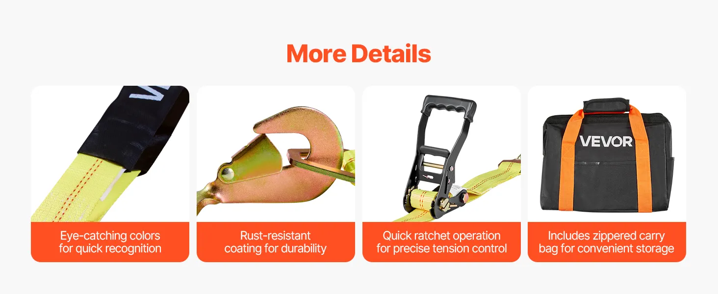 Featuring an eye-catching bright color design, this car tie down strap is easy to see and operate. The rust-resistant surface ensures durability, while the zipper storage bag is portable and easy to store for reliable use.
