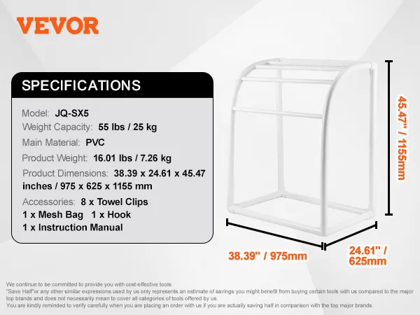 The VEVOR pool towel rack isn't just for pool towels. It can be used for a variety of purposes. You can use it to dry beach towels and bath linens. It can be utilized for intended uses like drying beach towels and bath linens. This rack is also great for hanging large items like curtains and rugs. What else can you do with this towel rack? The rack comes with clips that are useful on windy days. This ensures your items stay in place. Even when using it to store pool floats and paddles too. So, it can provide practical solutions for all your drying needs. Keep your home and pool area neat and organized with our versatile rack.