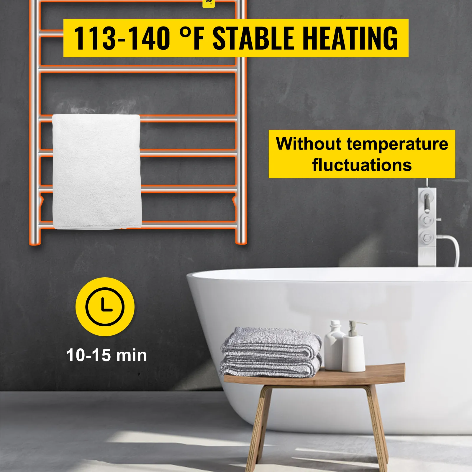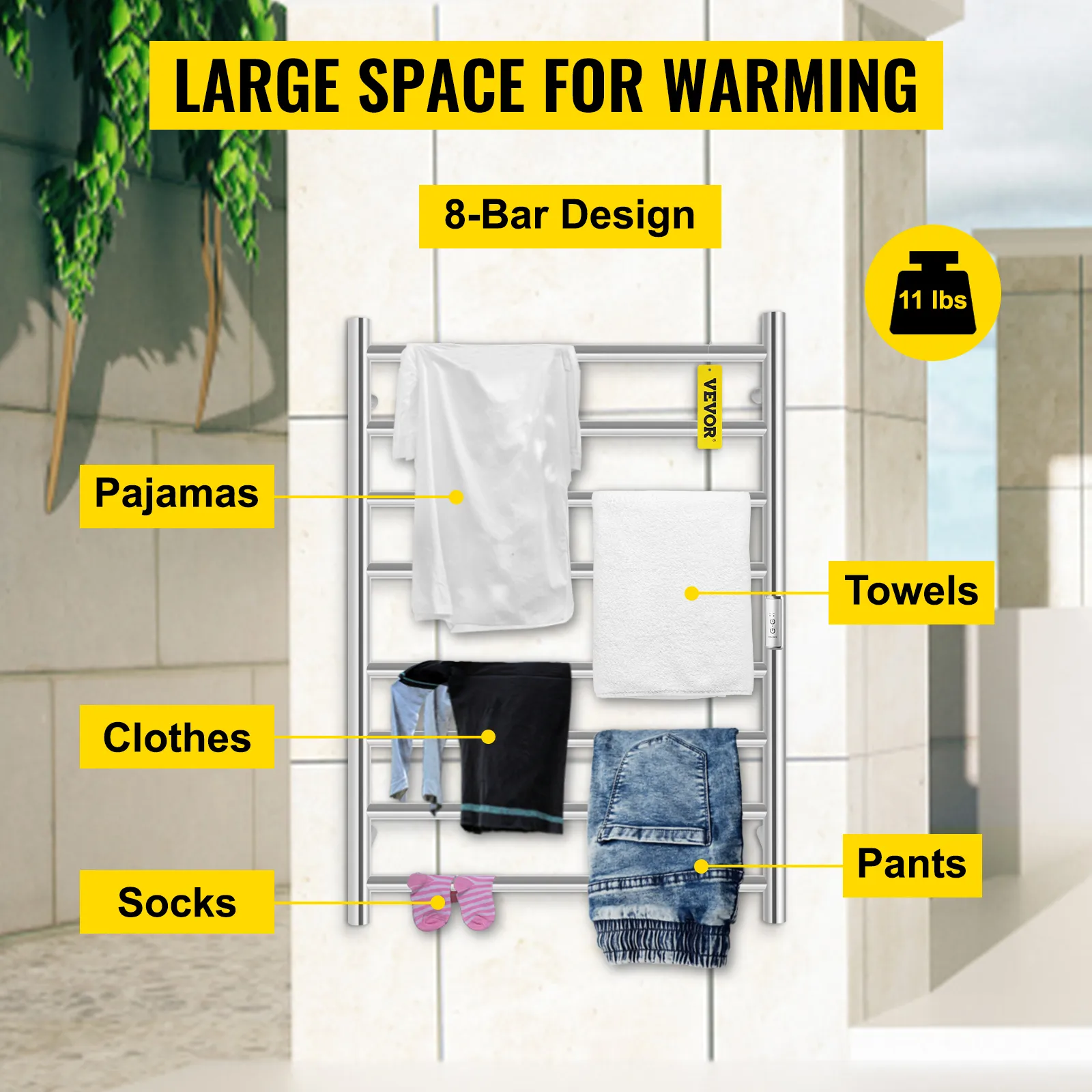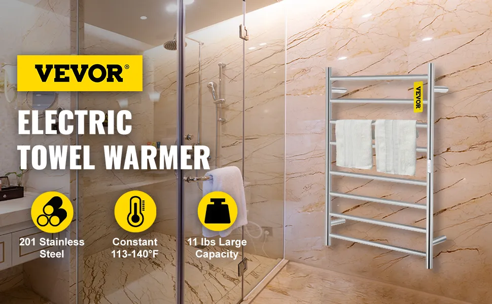 • Premium Towel Warmer: Our heated towel rack is designed with 8 bars to provide ample enough space to warm your towels and clothes, improving the heating speed at the same time. Superior to other products, our rack comes with 201 stainless steel and is treated with the polishing surface, featuring corrosion-proof, water-proof, and durable use for a long time. UL certificated.