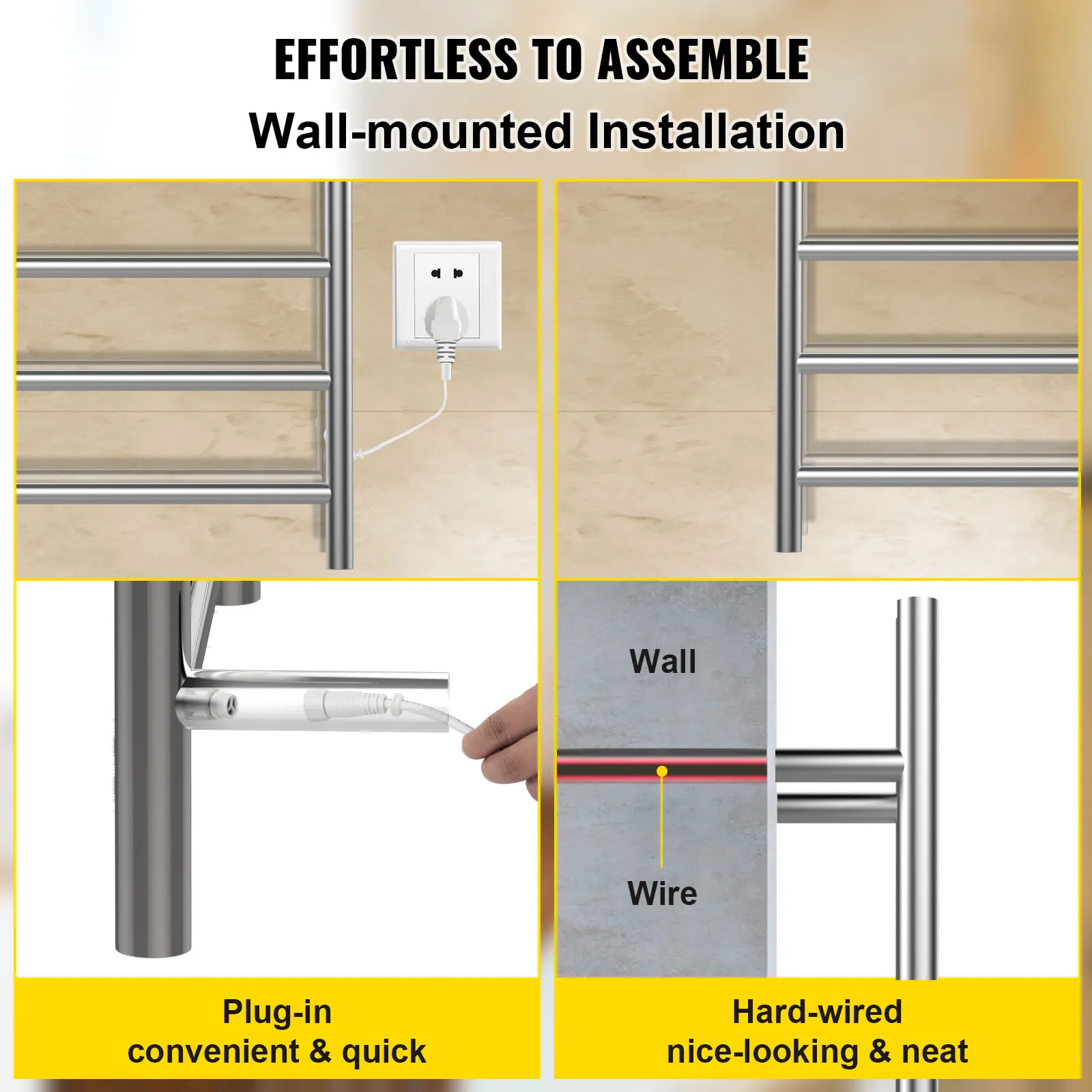 • Wall-mounted Installation: Our high-quality electric towel drying rack can be easily installed on the wall. If you want to make your wall looks neat, you can choose the hard-wired way to hide the cables. Otherwise, you will get an effortless setup by selecting a plug-in. Both left and right sides are designed for your assembly.