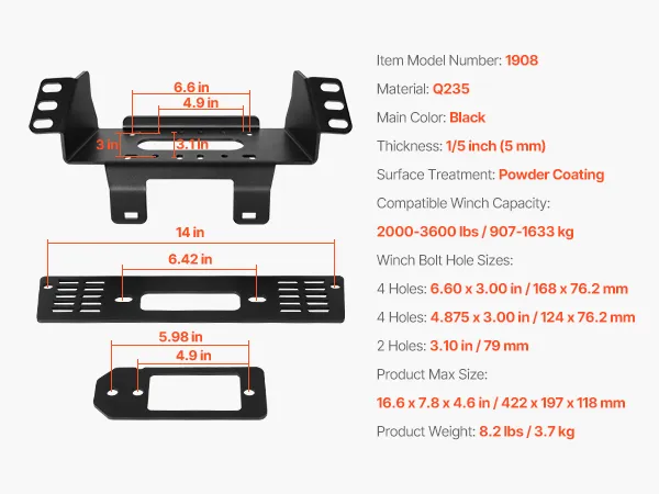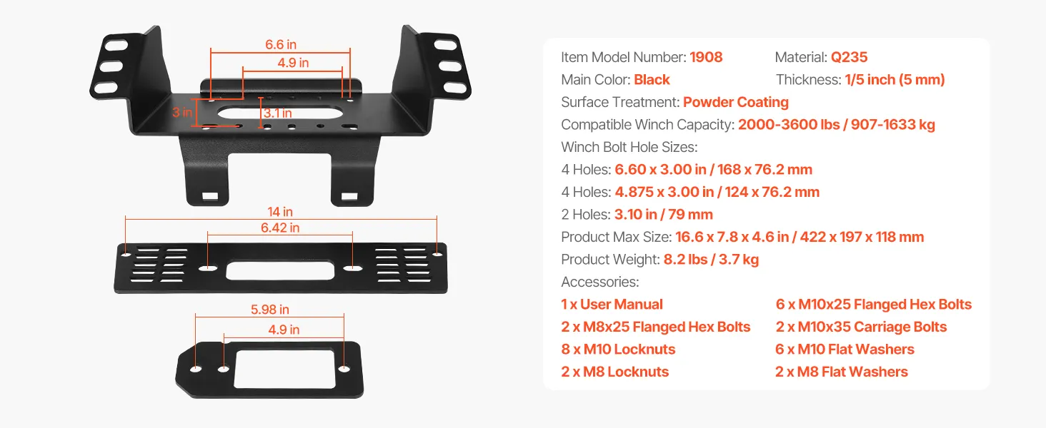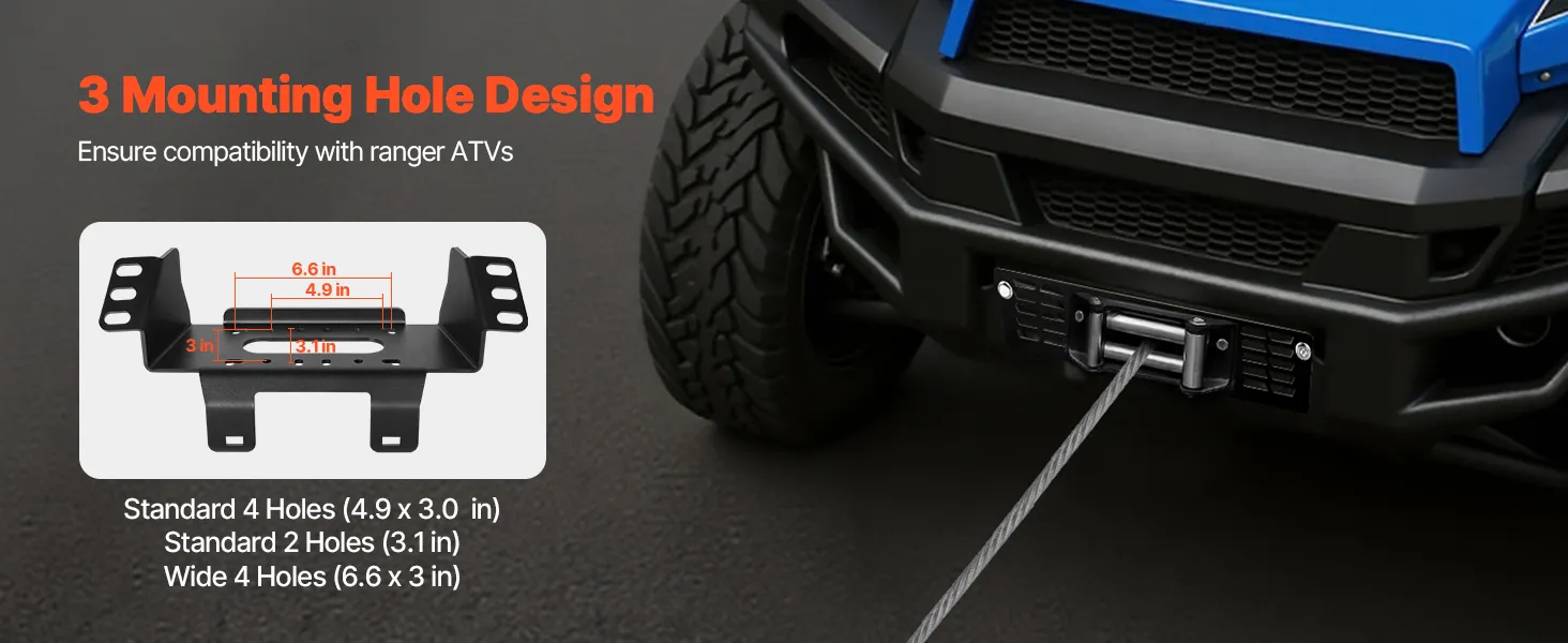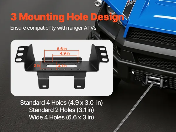 3 Winch Mounting Holes: The trailer winch mount supports 4-hole standard (4.9 x 3.0 inches), 2-hole standard (3.1 inches), and wide 4-hole (6.6 x 3 inches) hole configurations. The versatile design fits most standard winches, ensuring broad compatibility for different user needs