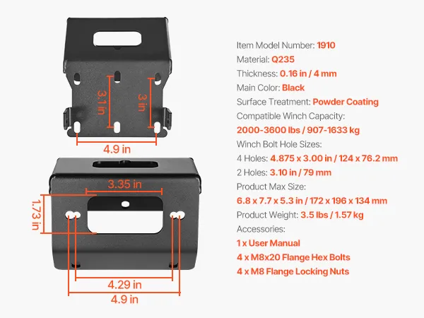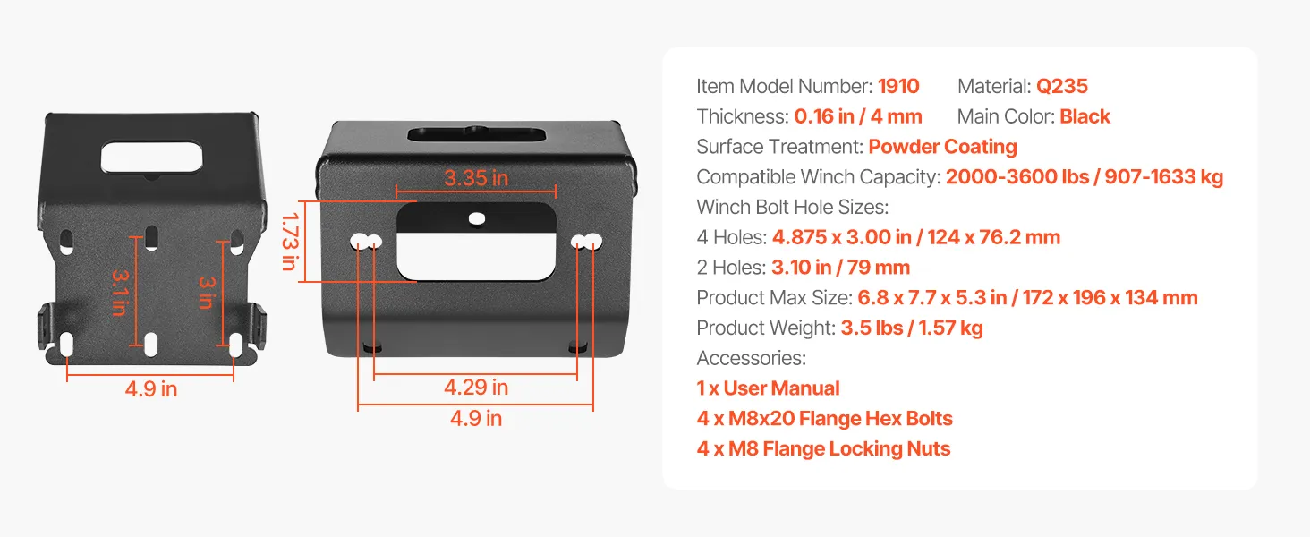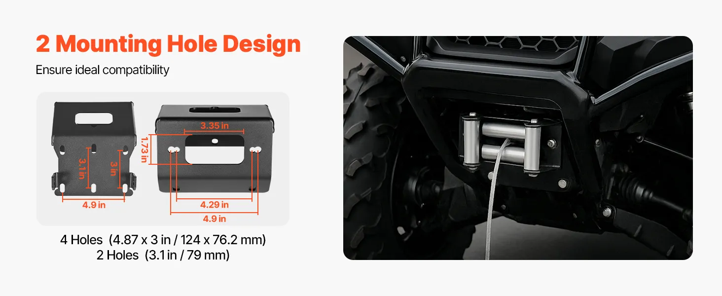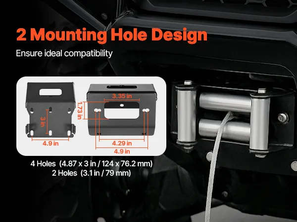 2 Winch Mounting Holes: The trailer winch mount supports 4-hole standard (4.9 x 3.0 inches) and 2-hole standard (3.1 inches) hole configurations. The versatile design fits most standard winches, ensuring broad compatibility for different user needs