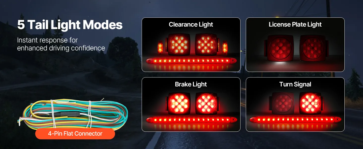 Multi-Function Trailer Light Kit: The trailer lights include 5 modes (turn signals, tail, brake, license plate, and clearance lights), enabling clear signaling in all road conditions. It complies with traffic rules, meeting all driving needs