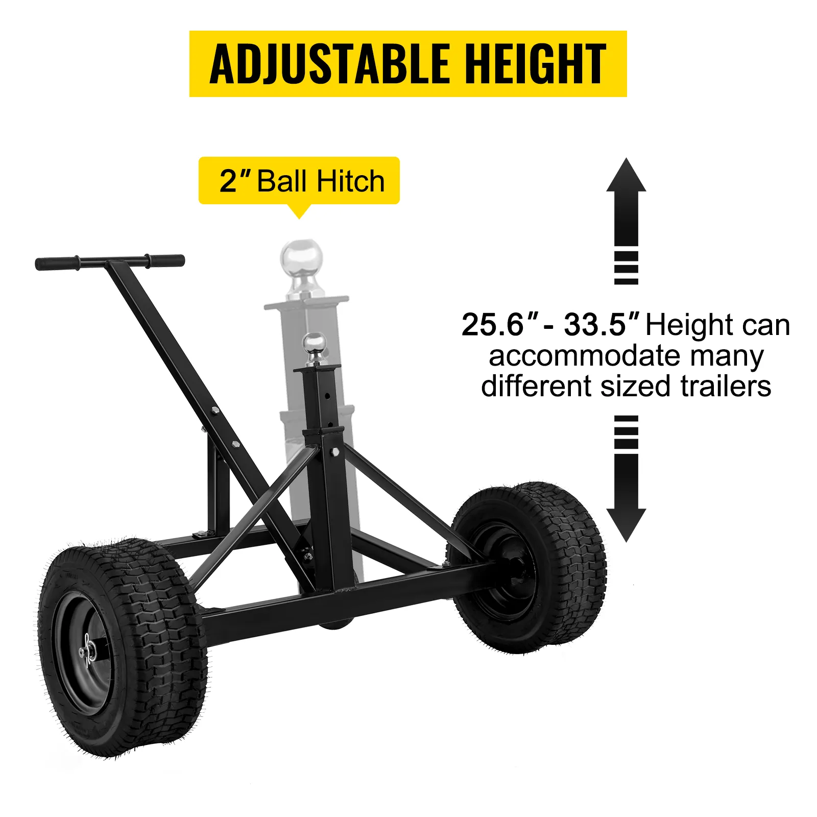 The height can be adjusted from 25.6" -33.5" to fit various sized trailers. The hitch ball size is 2" to work with a 2" coupler or larger.
