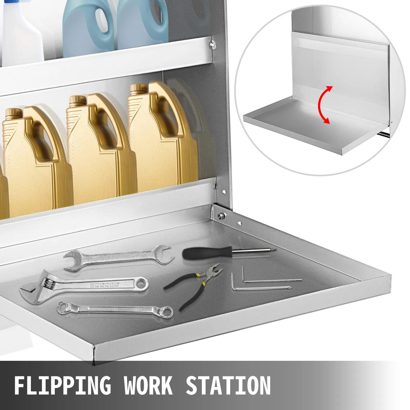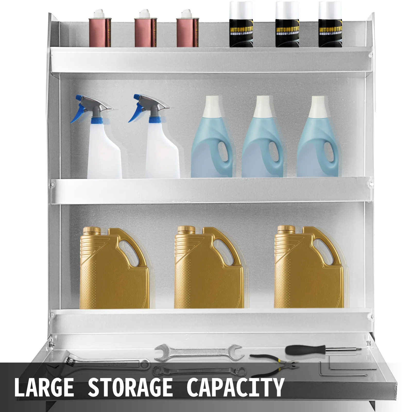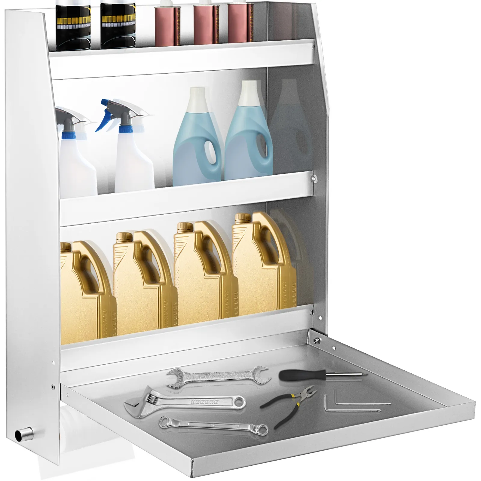 This cabinet has integrated Trailer Door Cabinet, Wall Organizer, and Work Station into one unit. You can compactly store aluminum aerosol cans, engine oil as well as transmission oil. The top shelf stores aerosol cans. The second and third shelf stores a case (12) or more (depending on bottle configuration) of oil.