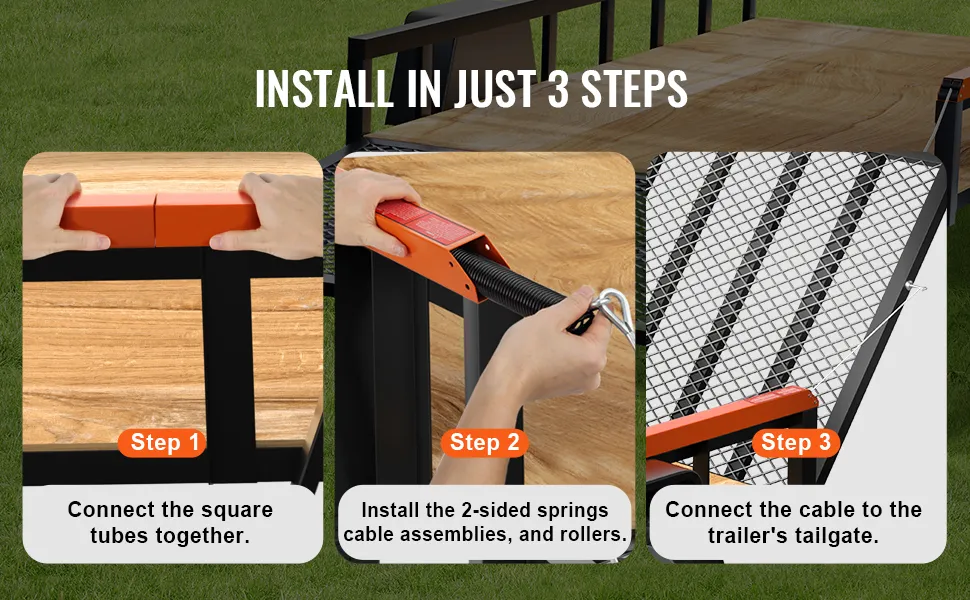 Installing our utility trailer gate lift assist is quick and hassle-free. With just three simple steps and the help of included accessories, you'll have it up and running in no time.
