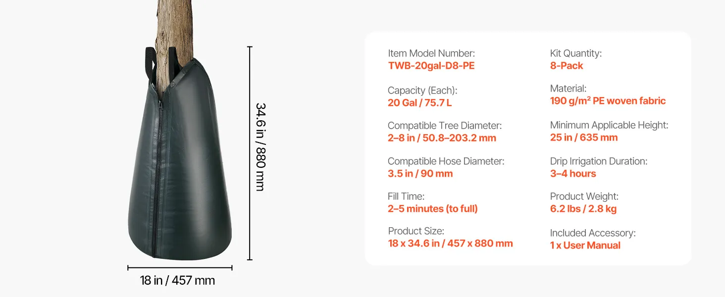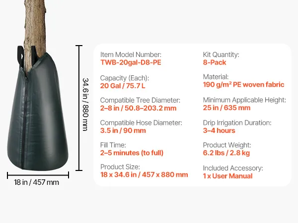 Wide Compatibility: The 8-pack tree watering bags slow release fits trees with trunk diameters from 2–8 in (50.8–203.2 mm) and a minimum height of 25 in (635 mm). For larger trunks, two bags can be zipped together to provide extra coverage and capacity