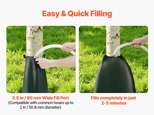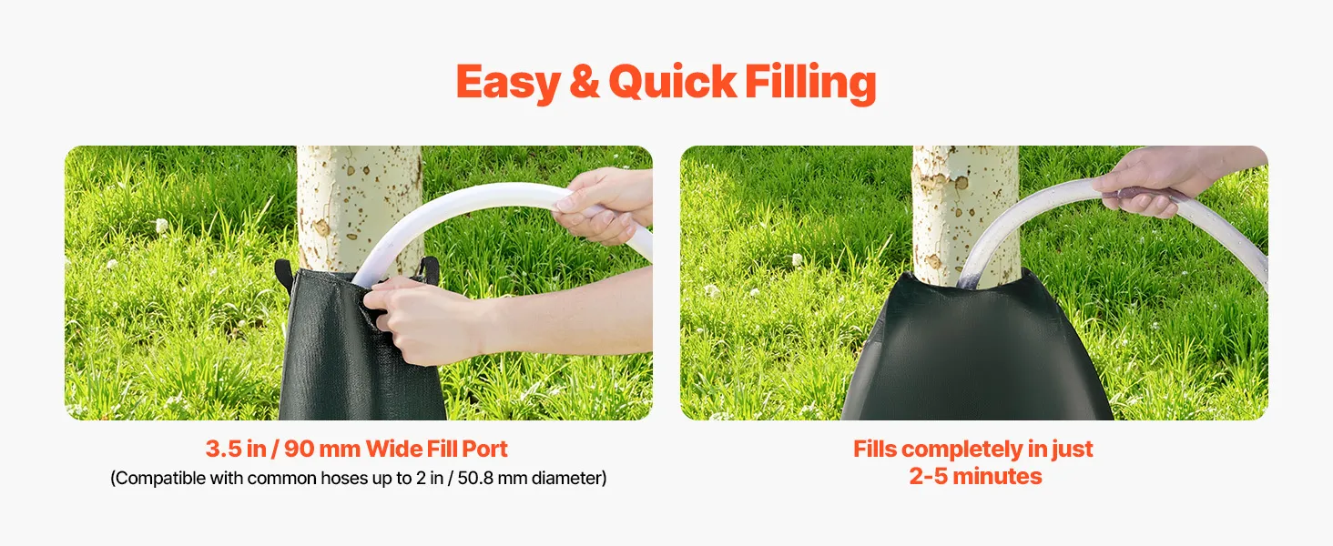 Quick & Easy Installation: Wrap the tree bag for watering around the trunk, zip it closed, and fill with water. The 3.5 in (90 mm) wide opening fits standard hoses up to 2 in (50.8 mm) in diameter, allowing the bag to fill in just 2–5 minutes