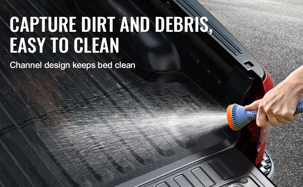 The surface grooves naturally capture mud and debris, preventing them from splattering everywhere. You can quickly rinse the bed mat clean with a hose, and the flexible material allows for easy movement and folding for cleaning.