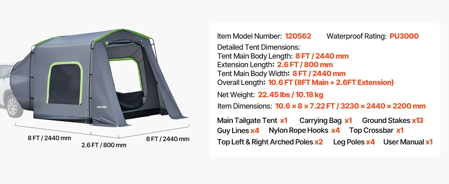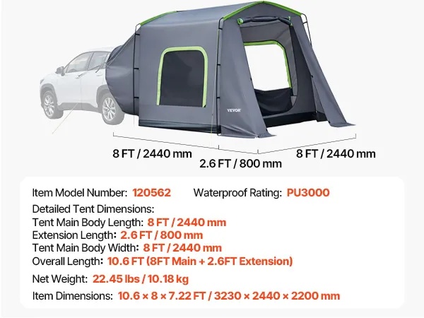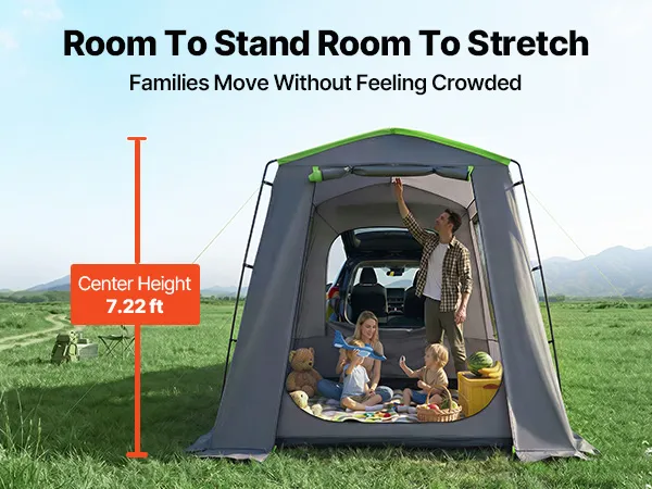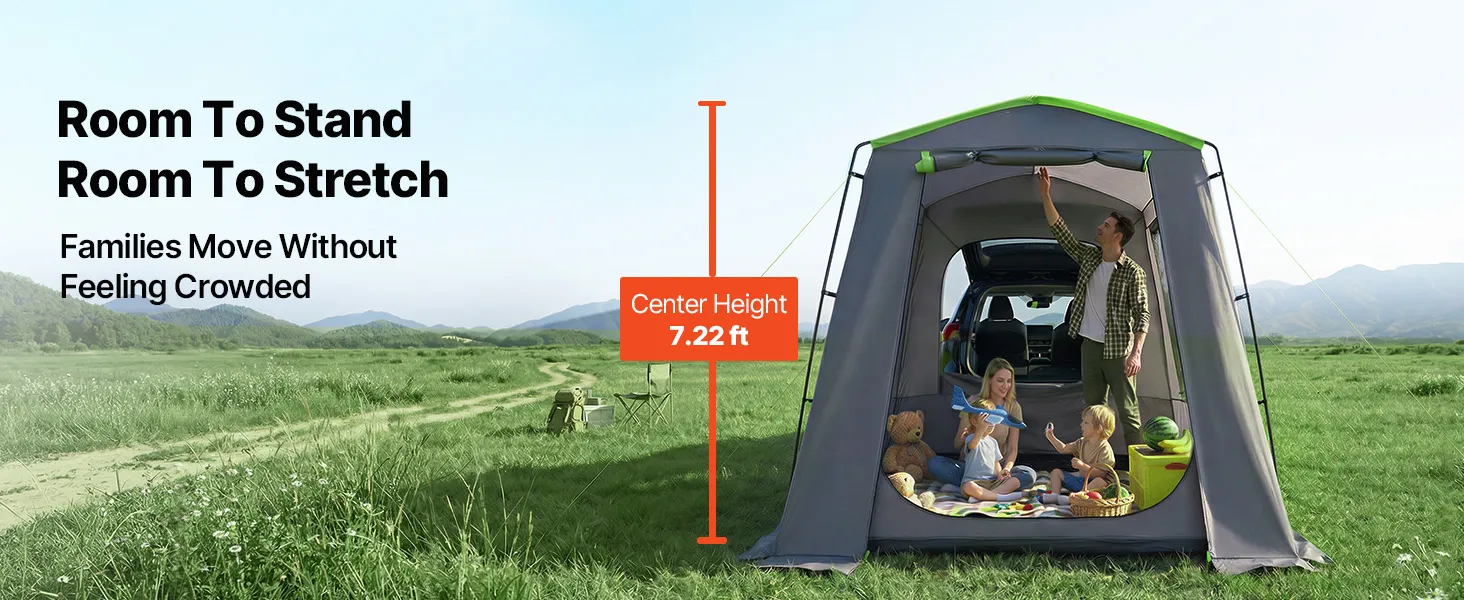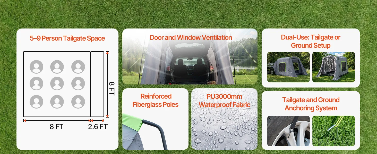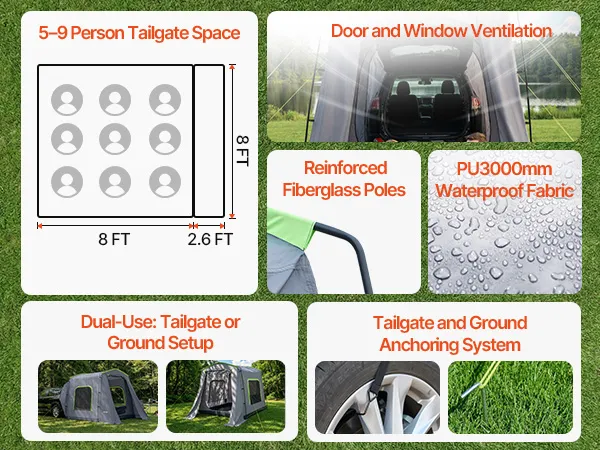 Roomy & Comfortable: This 3.23 x 2.44 x 2.2m large SUV tent creates a roomy tailgate camping space for 5–9 people to sit, relax, and enjoy time together without feeling cramped (Fits upward-opening rear-liftgate SUVs and small vans with rear perimeter ≤ 6.5m)