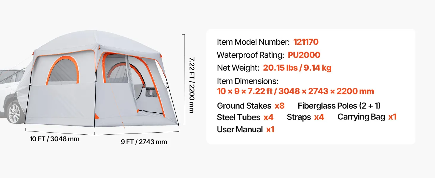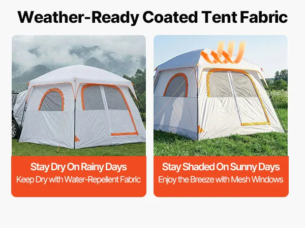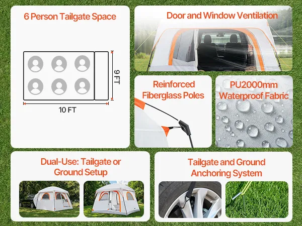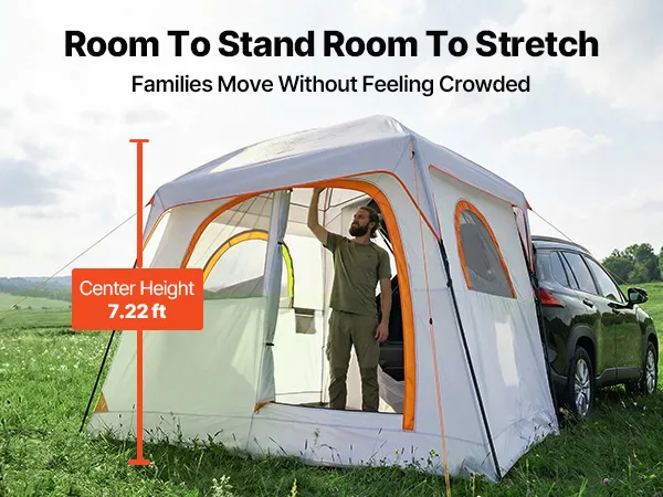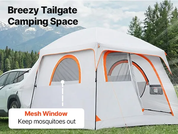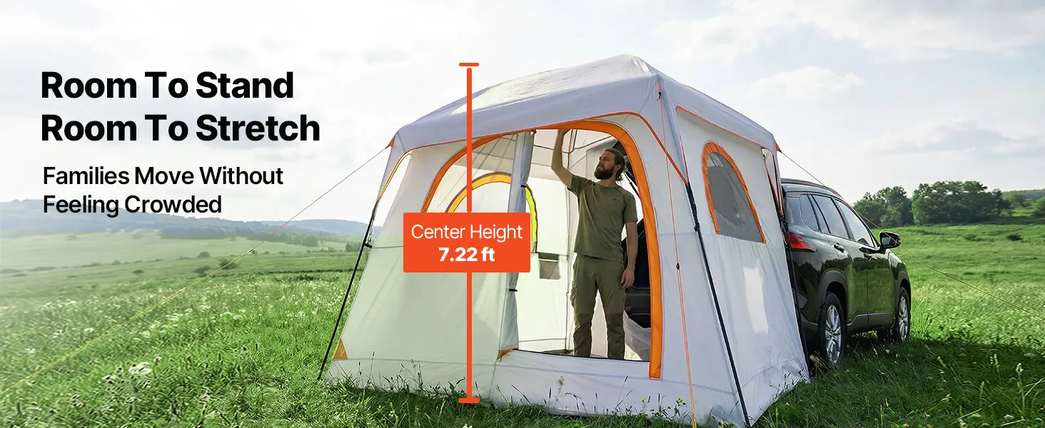 Spacious Camping Space: Let VEVOR 3.05 x 2.74 x 2.2m large SUV tent creat a roomy camping area for up to 6 people to sit, relax, and enjoy time together without feeling cramped (Fits upward-opening rear-liftgate SUVs and small vans with rear perimeter ≤ 6.5m)