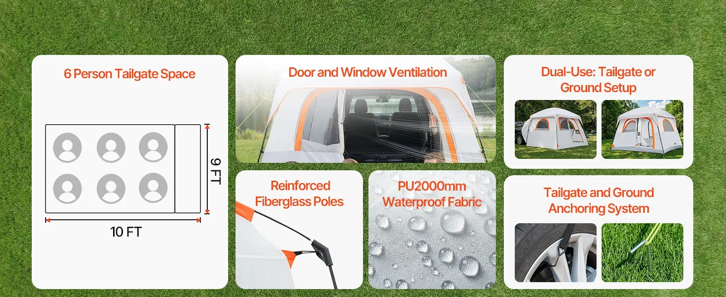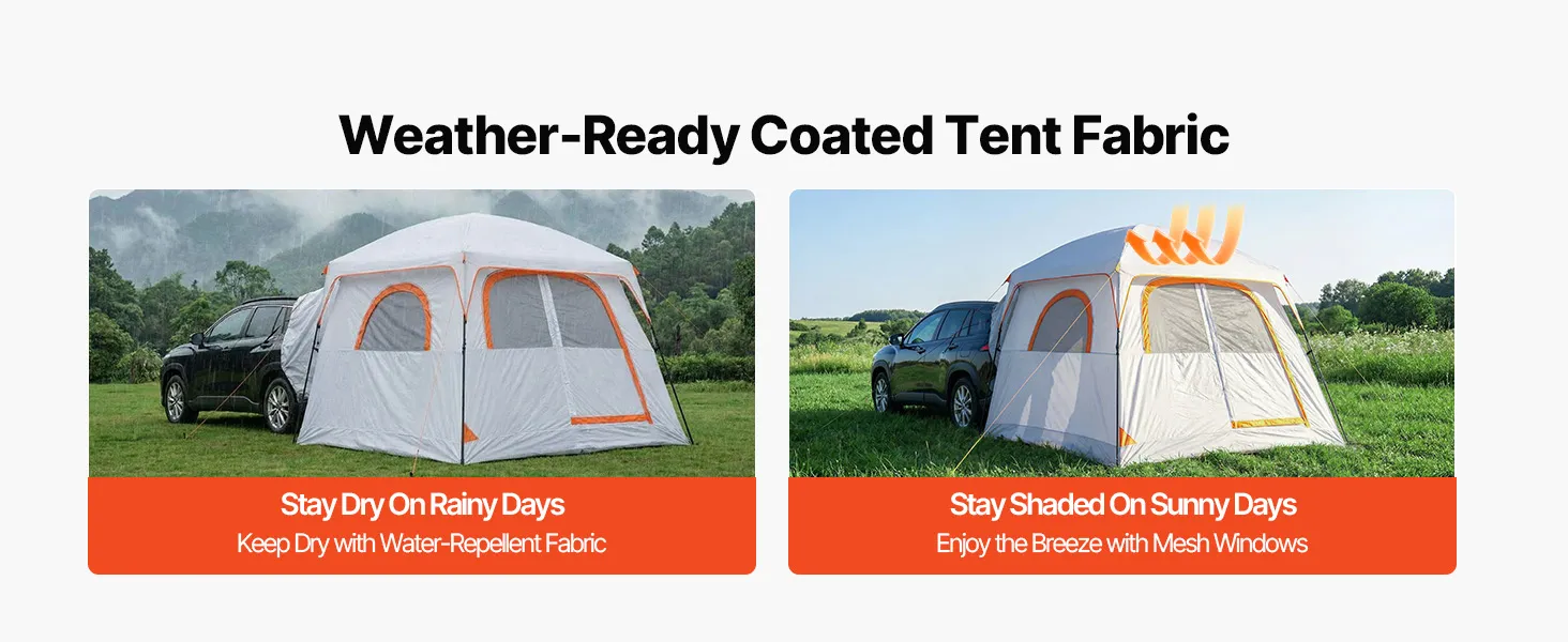 Waterproof & Durable: PU2000mm waterproof 210D Oxford fabric, combined with carefully taped seams and tight stitching, helps block rain penetration and resist tearing, keeping the tailgate lounging area dry, comfortable, and built to last