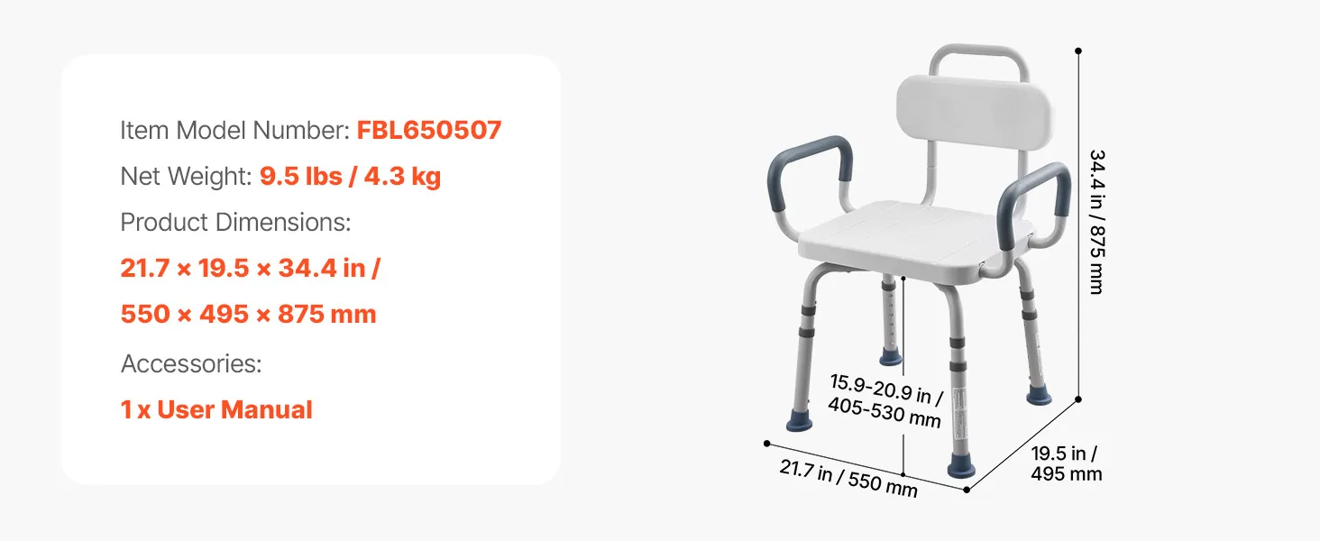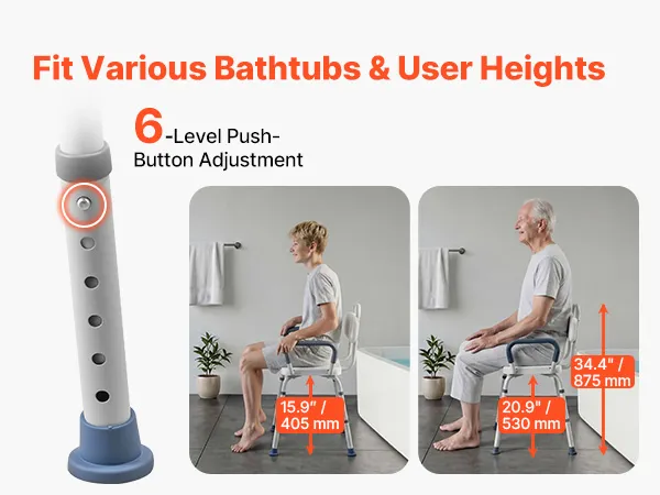 Adjustable Height: Our tub transfer bench provides 6-level push-button height adjustment for quick and easy setup. The seat-to-floor height ranges from 15.9" to 20.9" (405–530 mm), making it suitable for use in various bathroom environments