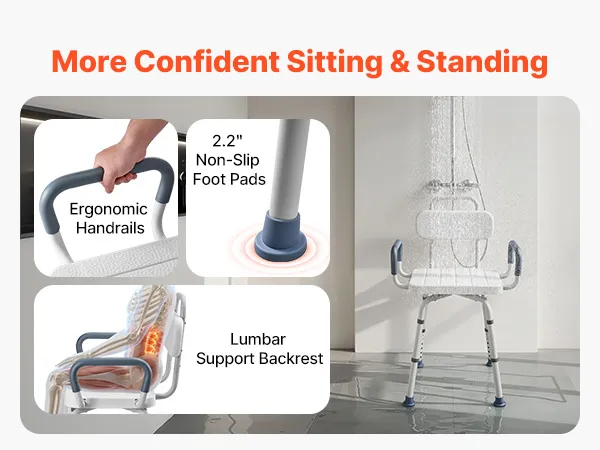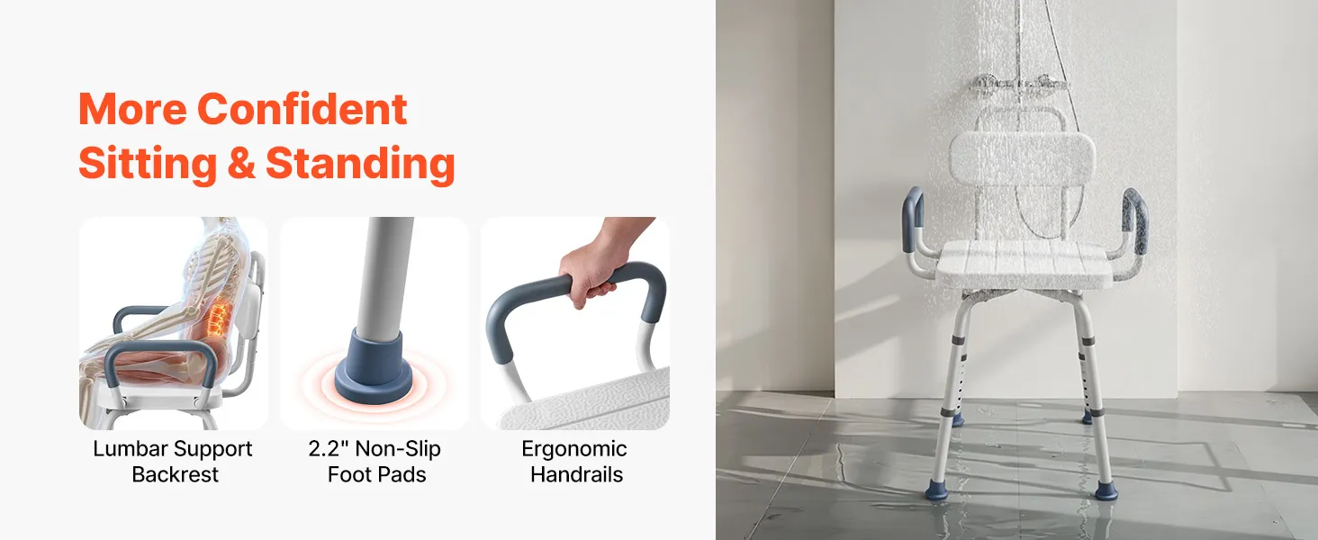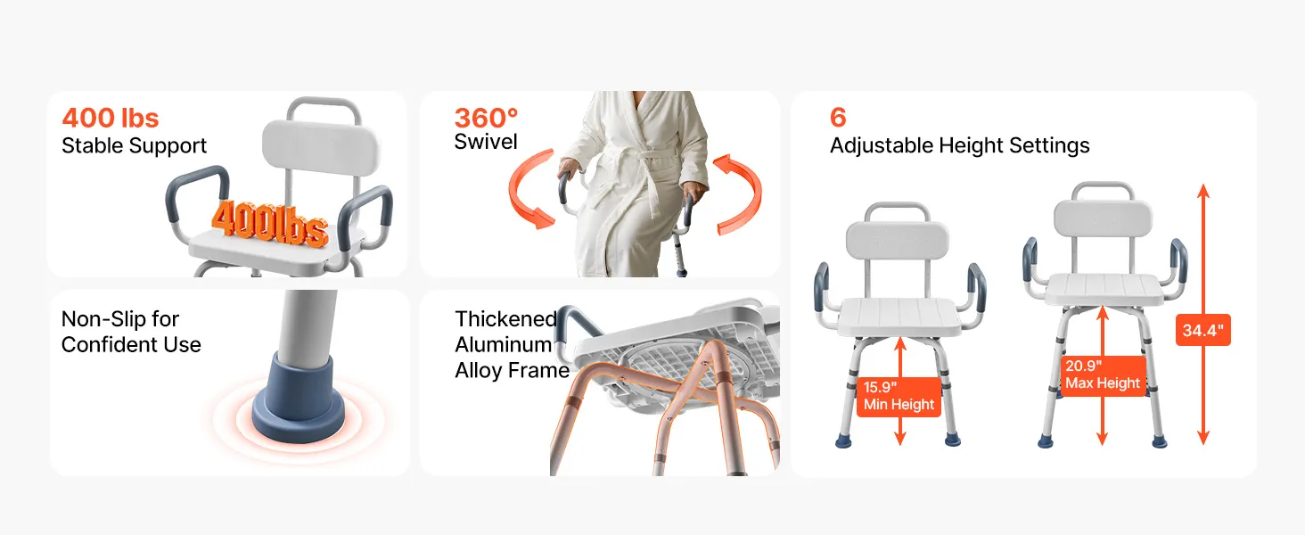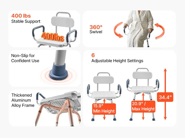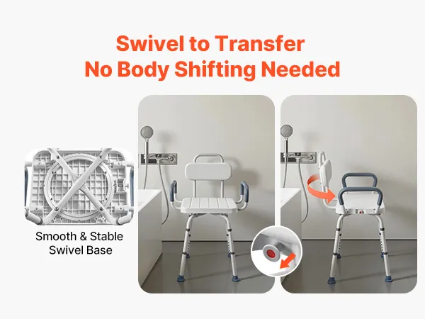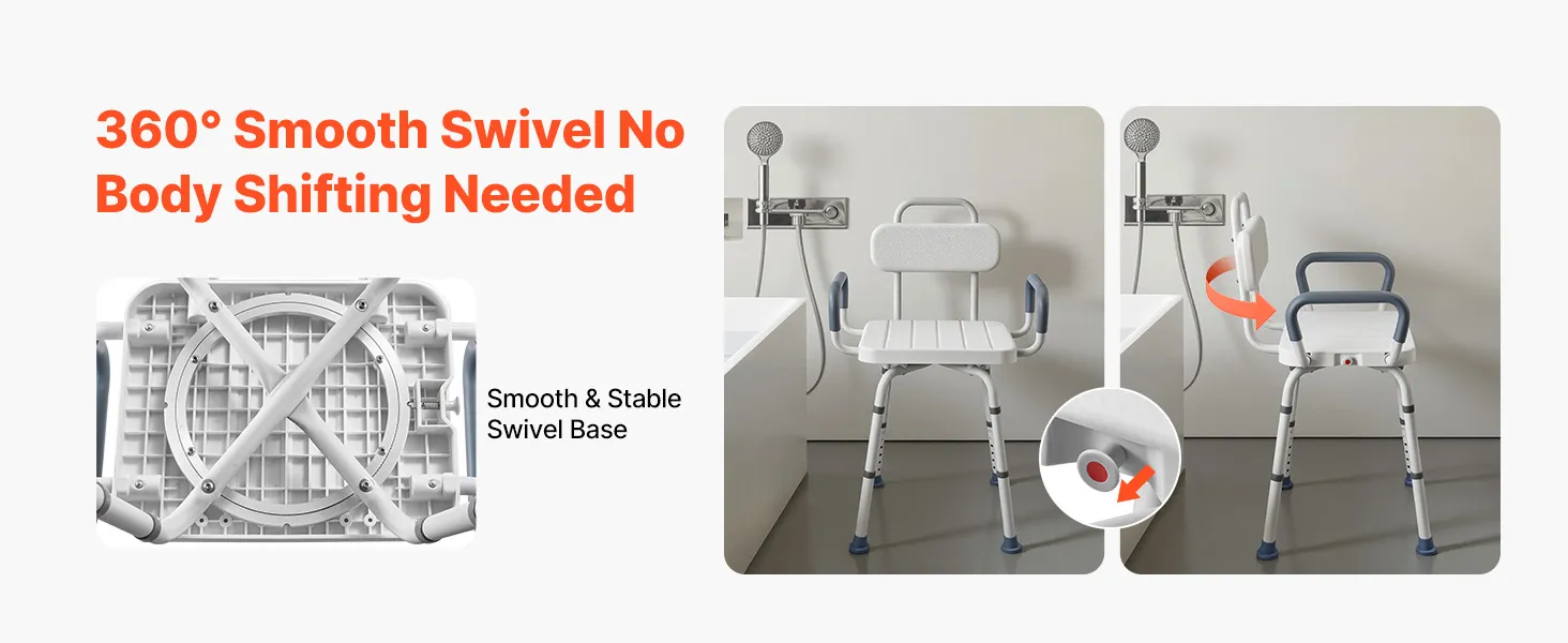 360° Swivel Chair: This shower chair features a smooth 360° swivel seat with a locking mechanism to hold it securely in place. It allows you to change direction and reach items easily without shifting your body during bathing