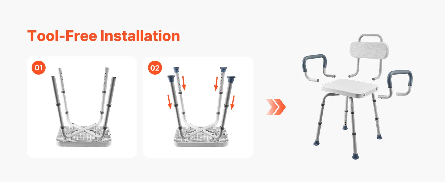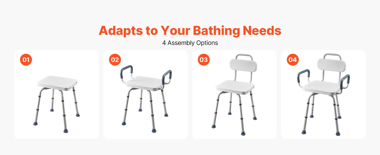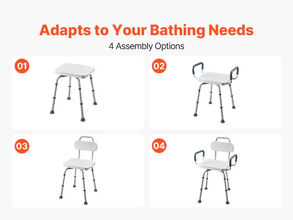 Tool-Free Installation: This transfer tub bench uses a push-button assembly system for quick, tool-free setup. It supports four assembly options, including configurations without a backrest or without armrests, to match different user needs