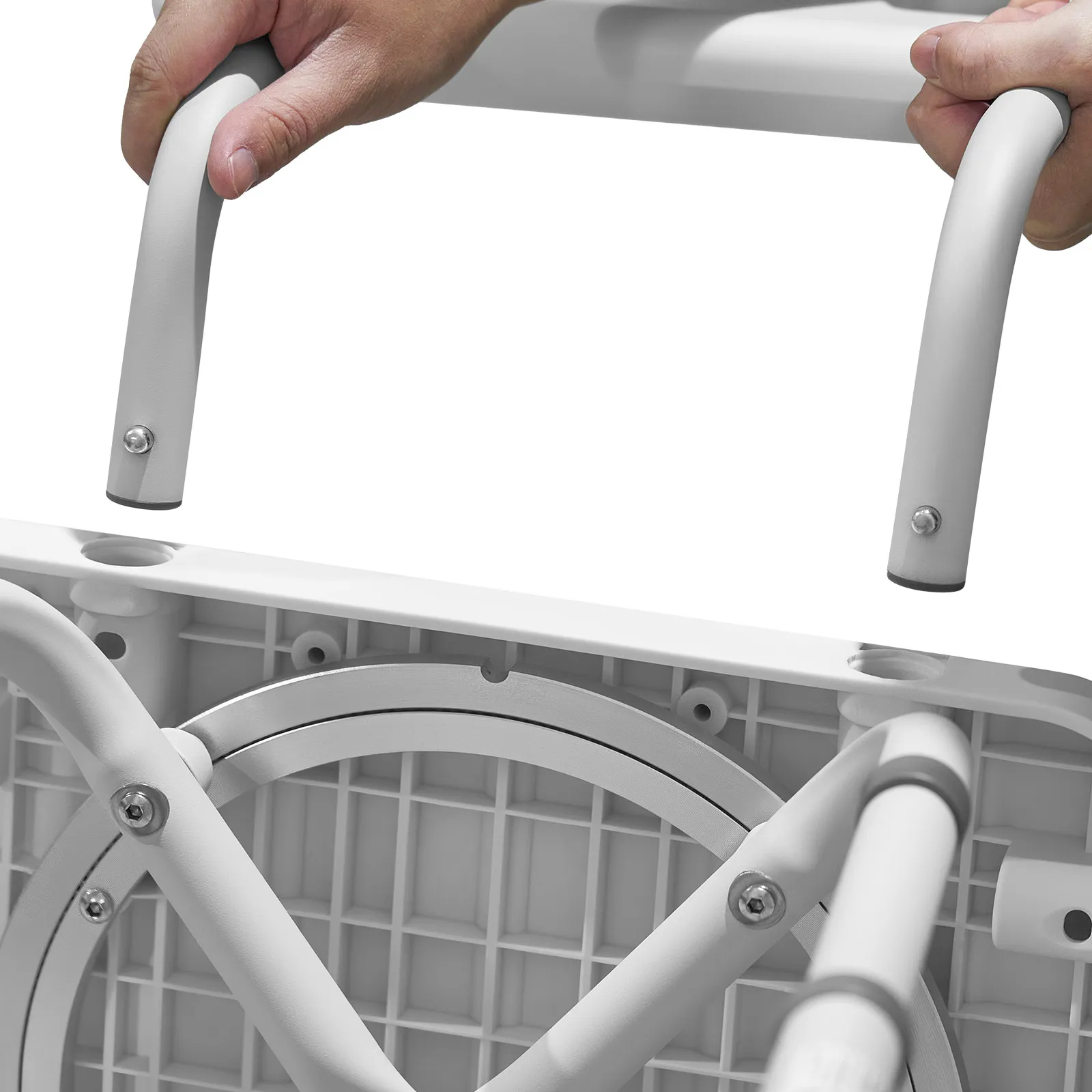 The shower transfer bench uses a push-button assembly system for fast and secure setup. No additional tools are required, allowing it to be ready for use in minutes.