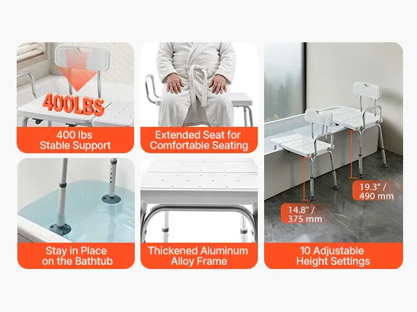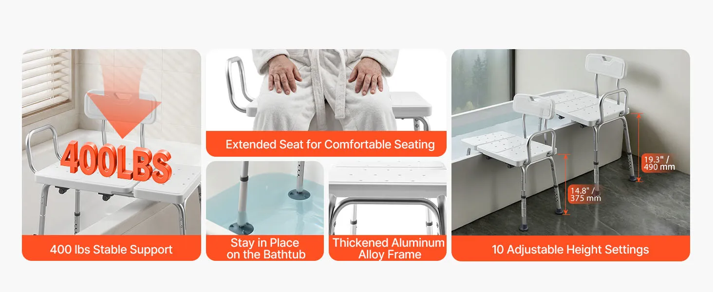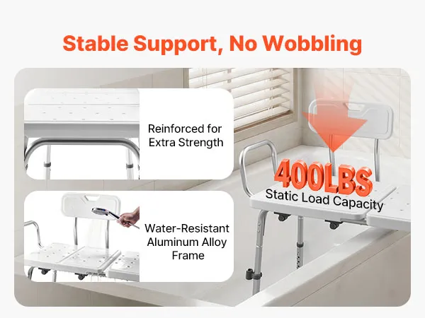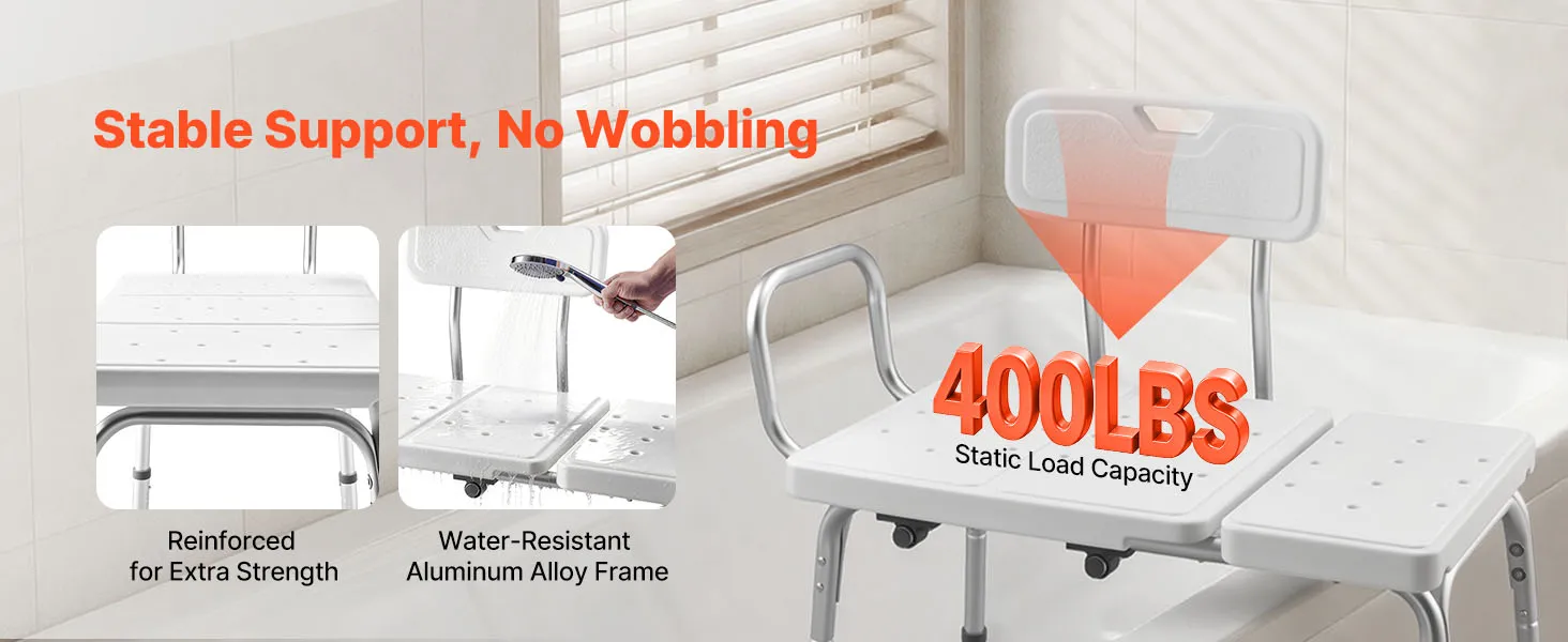 400 lbs Heavy-Duty Capacity: The shower transfer bench is built with a thickened aluminum alloy frame and reinforced U-shaped side braces for added stability. It supports up to 400 lbs (180 kg) static load for steady sitting and transfers