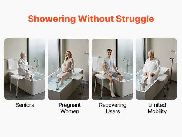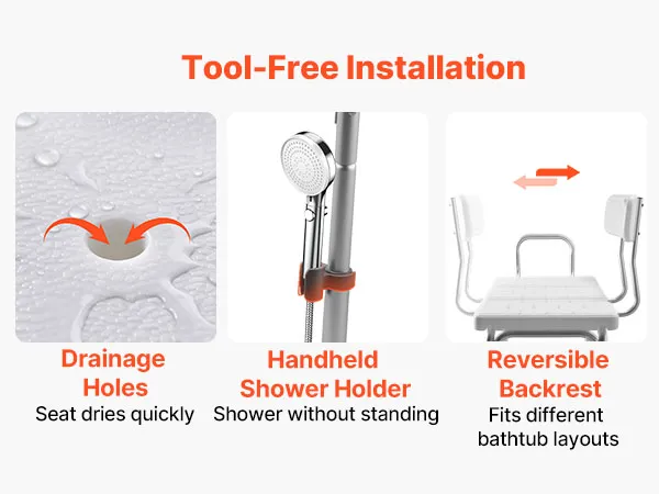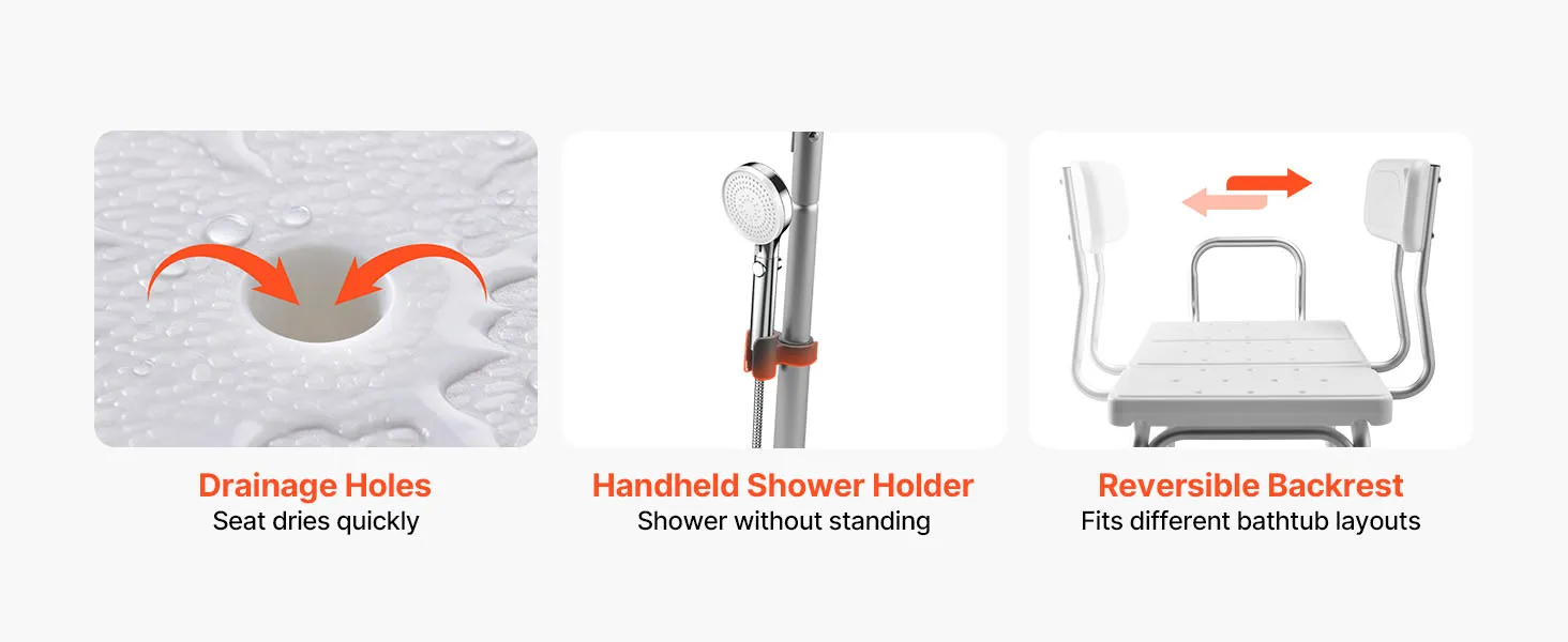 User-Friendly Design: Designed with user habits in mind, our tub bench features a supportive backrest and a spacious seat for relaxed leaning. Drainage holes help the seat dry quickly, while the handheld shower holder allows showering without standing