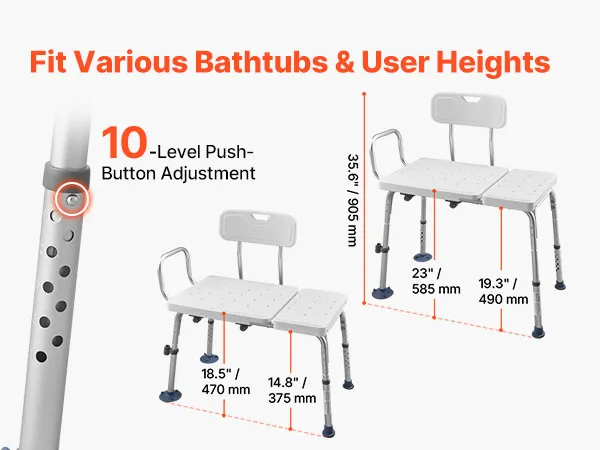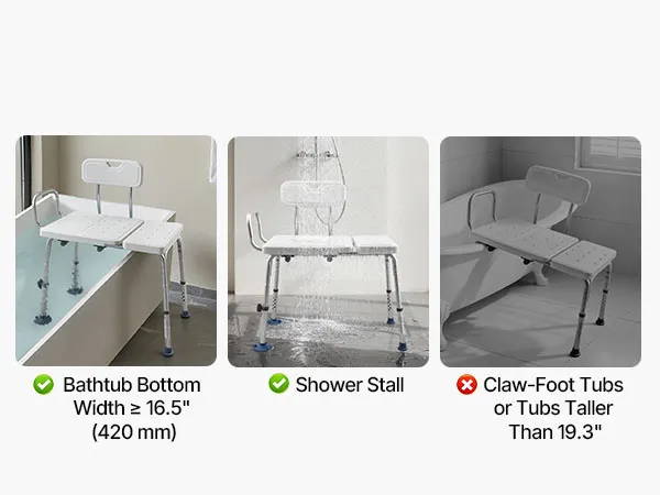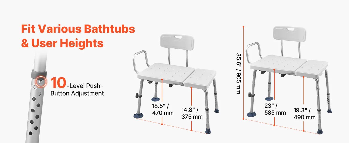 Adjustable Height: Our shower chair provides 10-level push-button height adjustment. Seat-to-floor height ranges from 14.8" to 19.3" (375–490 mm), fitting bathtubs with bottom widths ≥16.5" (420 mm). Not for tubs over 19.3" (490 mm) or claw-foot tubs