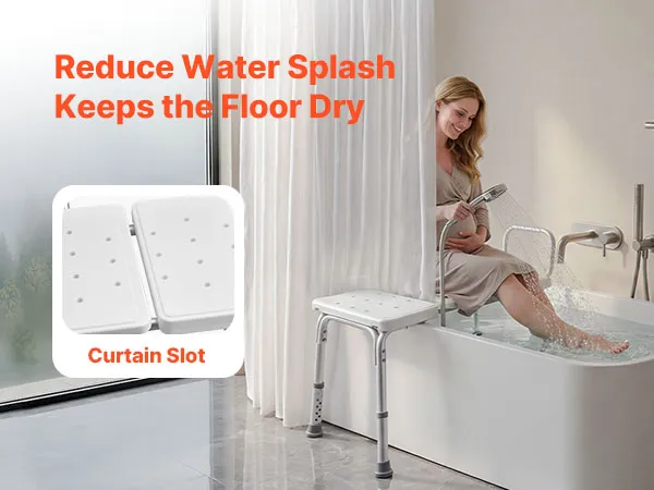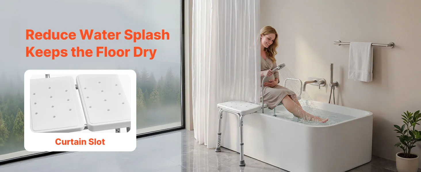 Curtain Slot Design: This tub transfer bench features an upgraded bath curtain slot that allows you to pull the curtain smoothly without obstruction. The design helps keep water inside the tub and stops splashes from wetting the bathroom floor