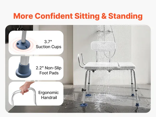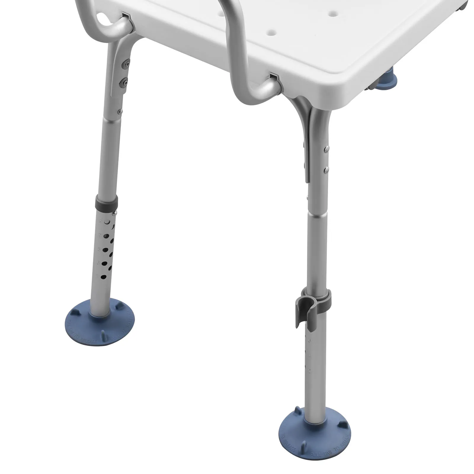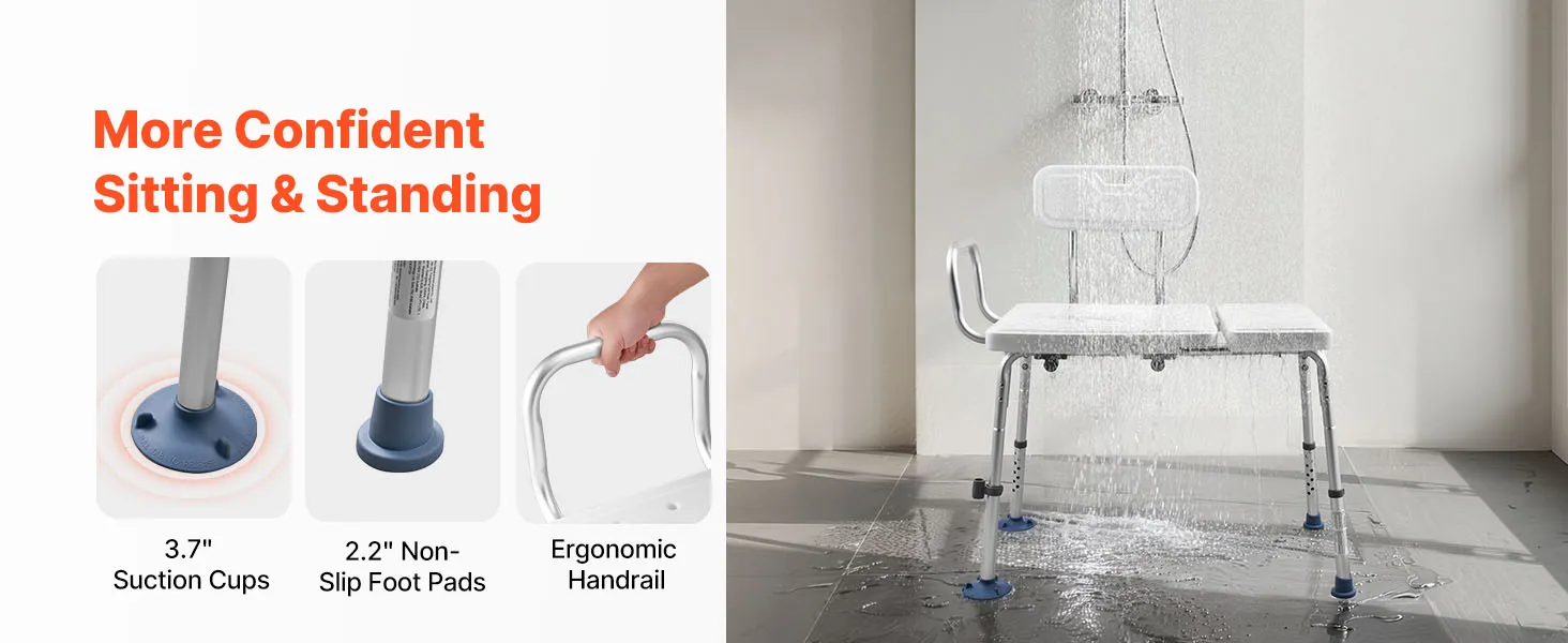 Our shower chair features a reinforced aluminum alloy frame designed for humid bathroom environments. The lightweight construction makes it easy to move while maintaining durability.