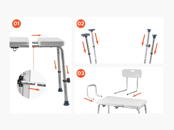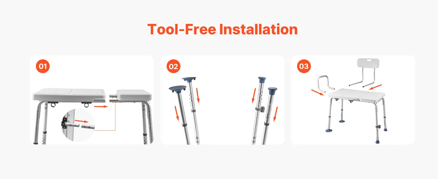 The shower transfer bench uses a push-button assembly system for fast and secure setup. No additional tools are required, allowing it to be ready for use in minutes.