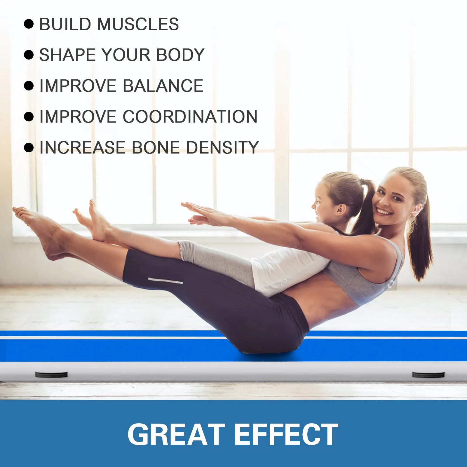 Thanks to its user-friendly design, inflating and deflating can be done in several minutes. You may exercise or have some fun on this inflatable gymnastics mat in minutes. (No Pump)
