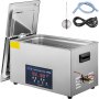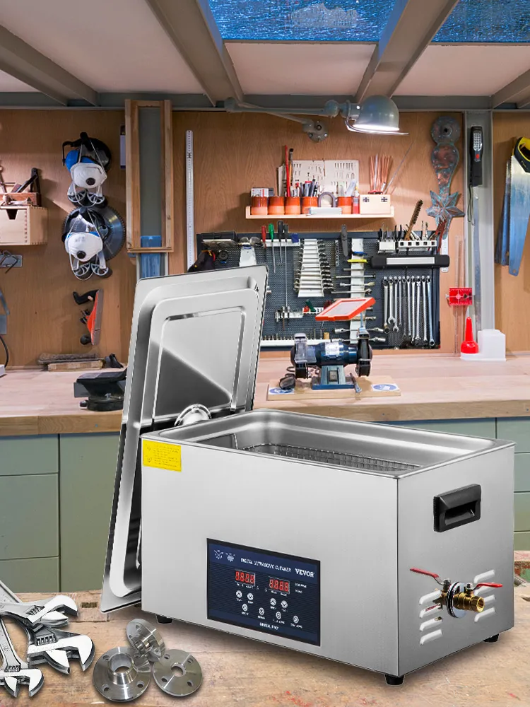 This ultrasonic parts cleaner is made from 304 stainless steel with a noise reduction lid and built-in handles on both sides, designed for durable use and easy cleaning.