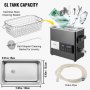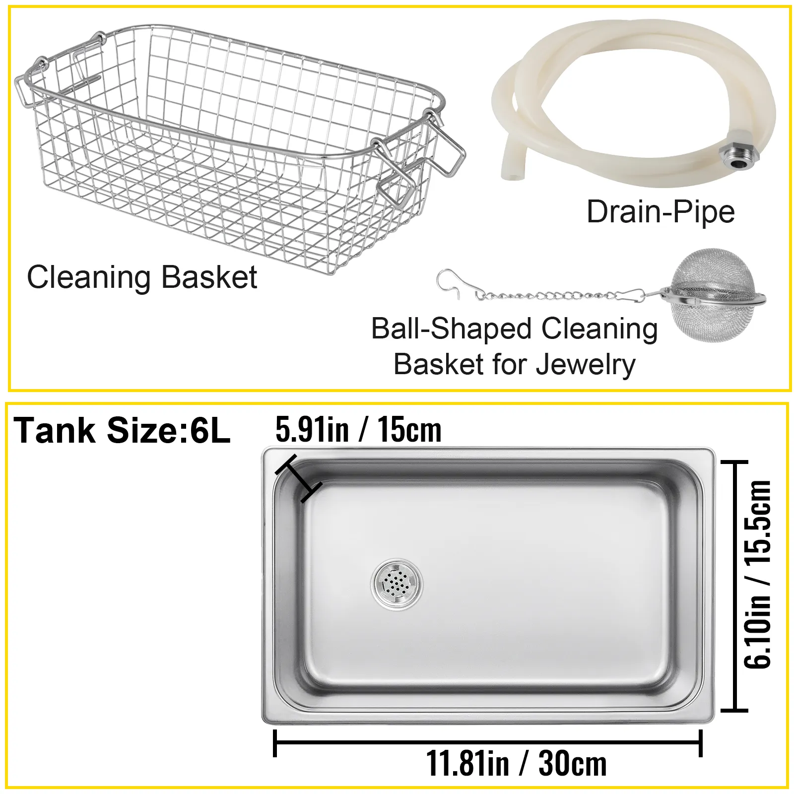 The sonic jewelry cleaner features a sizeable 6L/1.59 gal tank, coming with a cleaning basket and a ball-shaped jewelry cleaning basket to reduce friction during washing.