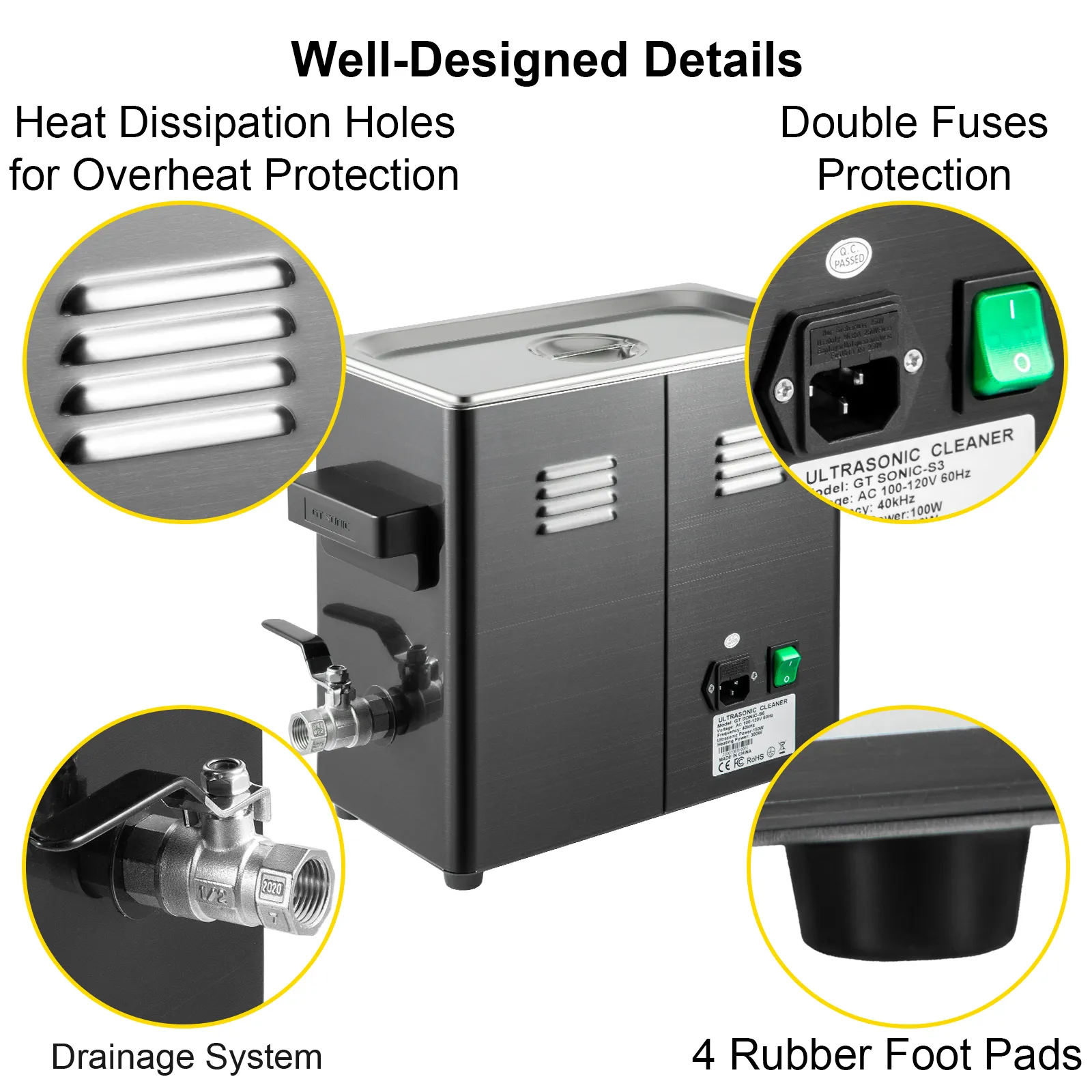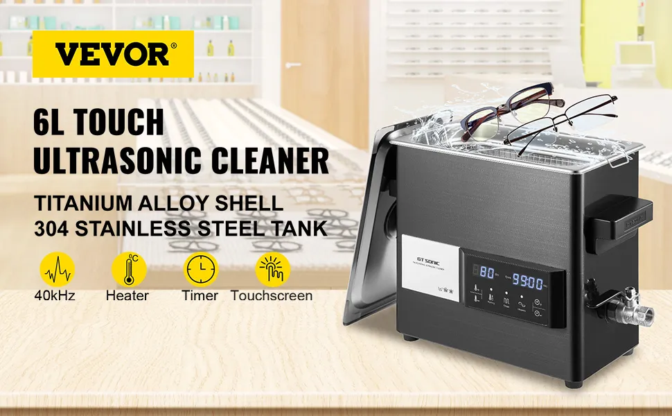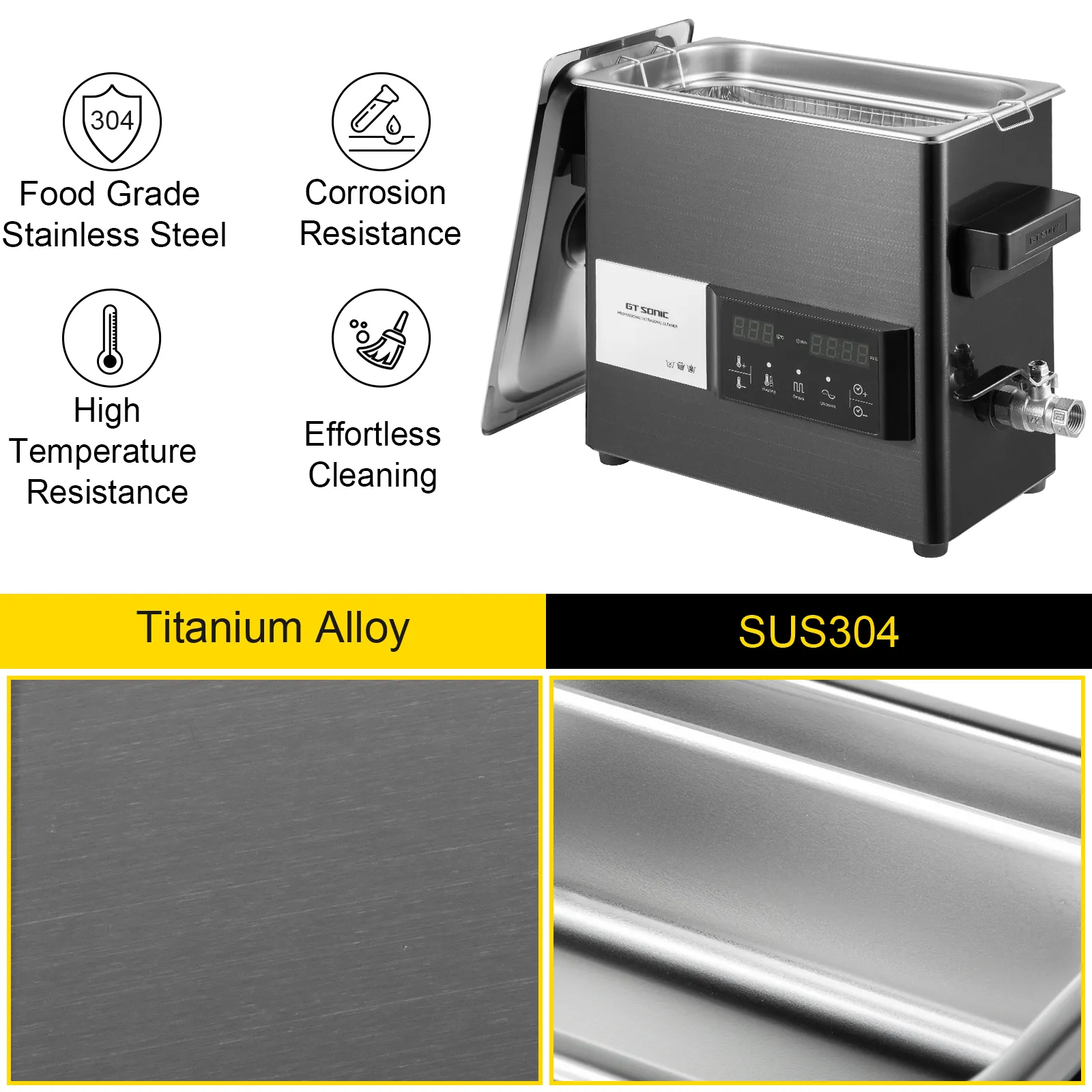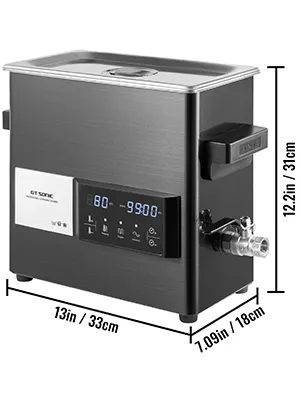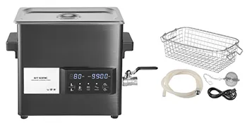 This commercial-grade ultrasonic cleaner is built with a titanium alloy shell and 304 stainless steel tank, making it an efficient machine for daily or professional cleaning work. Our ultrasound jewelry cleaner machine will emit 40kHz ultrasonic waves to wash dirt on your valuables' surface and crevice deeply. With heating and timing functions, your items can be cleaned thoroughly in minutes. Lab ultrasonic cleaners are ideal for cleaning jewelry, eyeglasses, watches, metal tools, etc.
