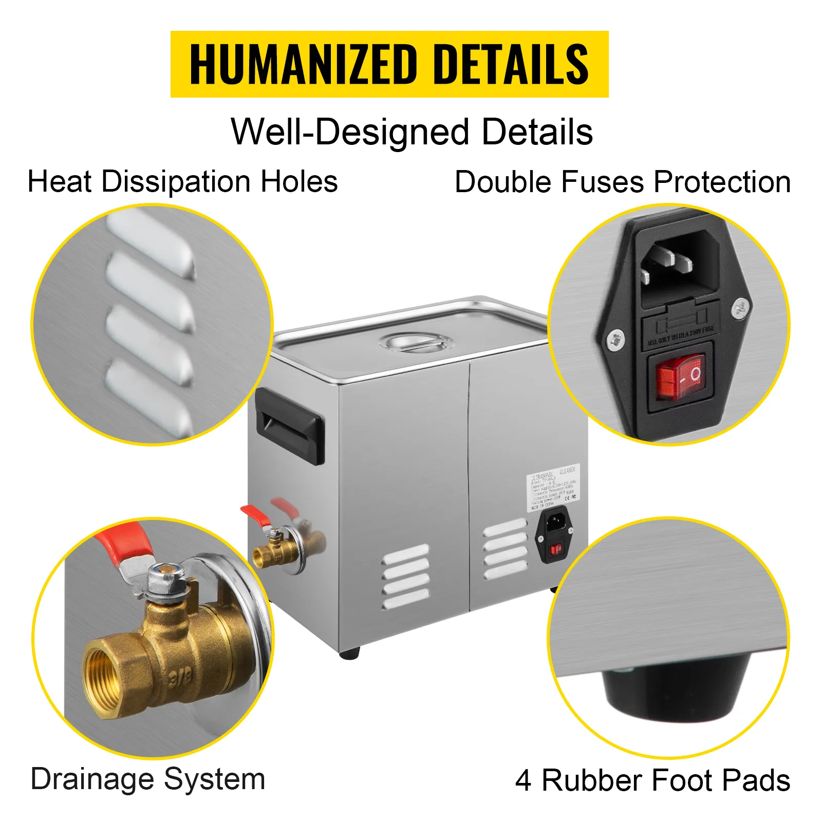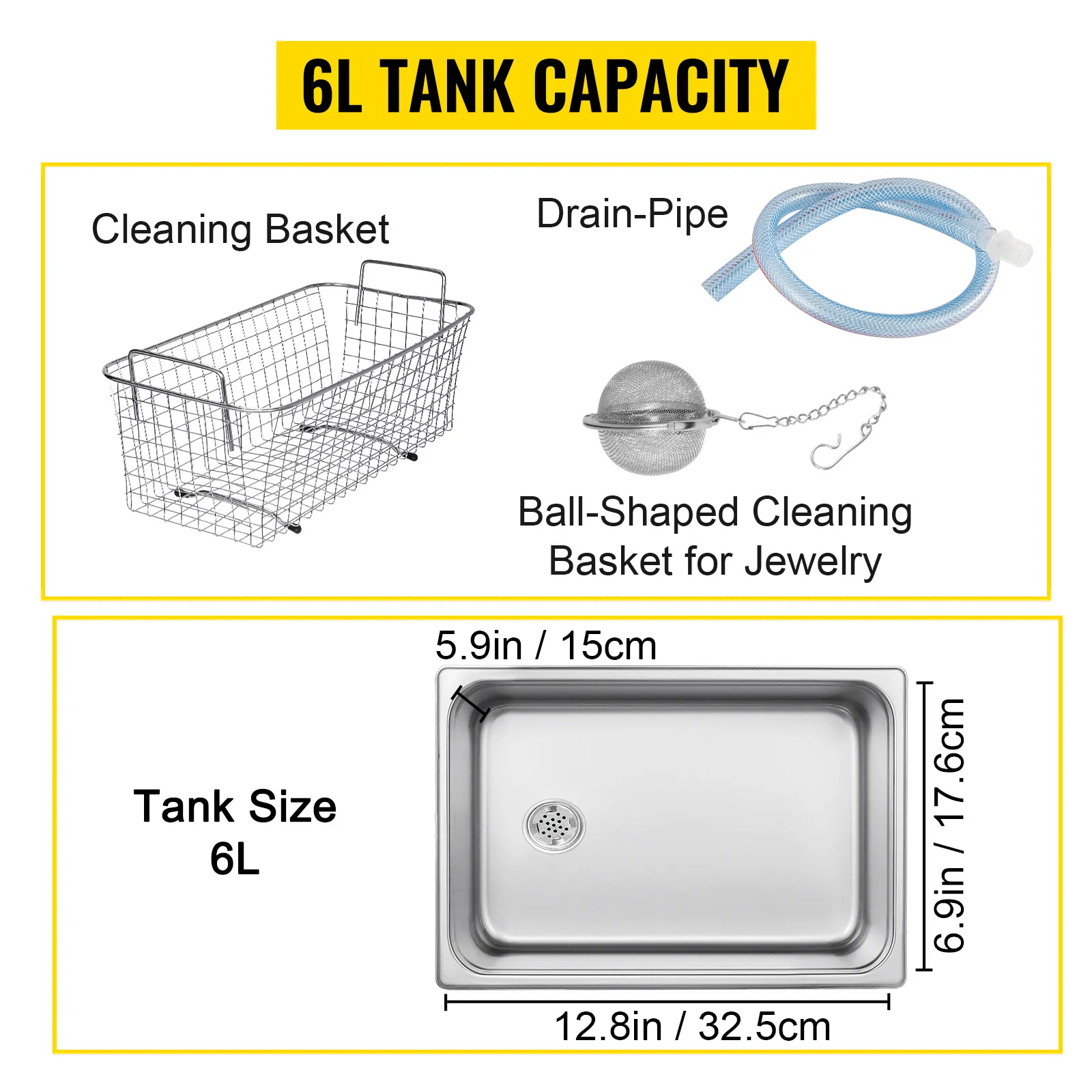 - Capacity: 5.8L-6L/1.5-1.6 Gal (Since the bottom of the ultrasonic cleaner is a curved surface, the actual volume will be smaller.)
