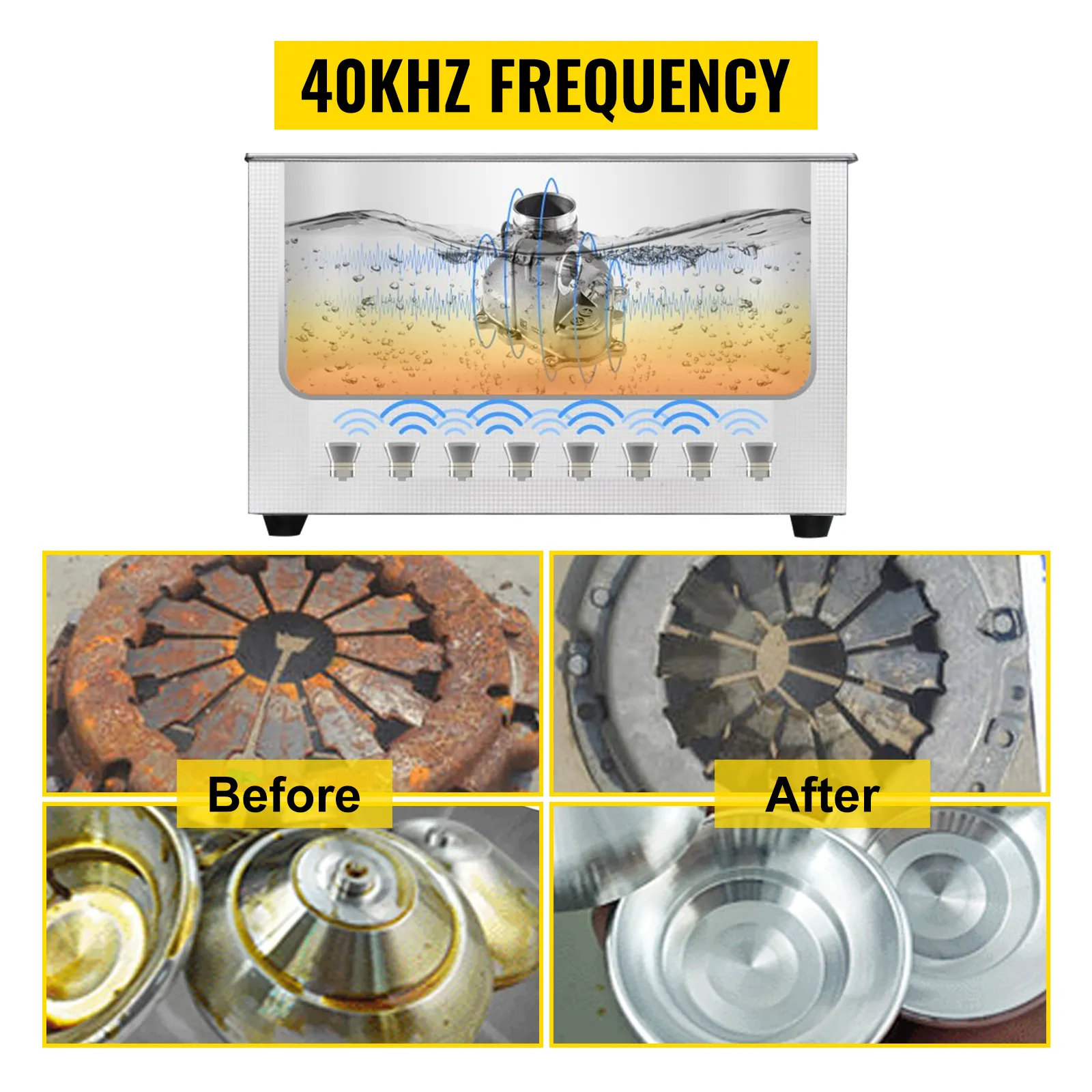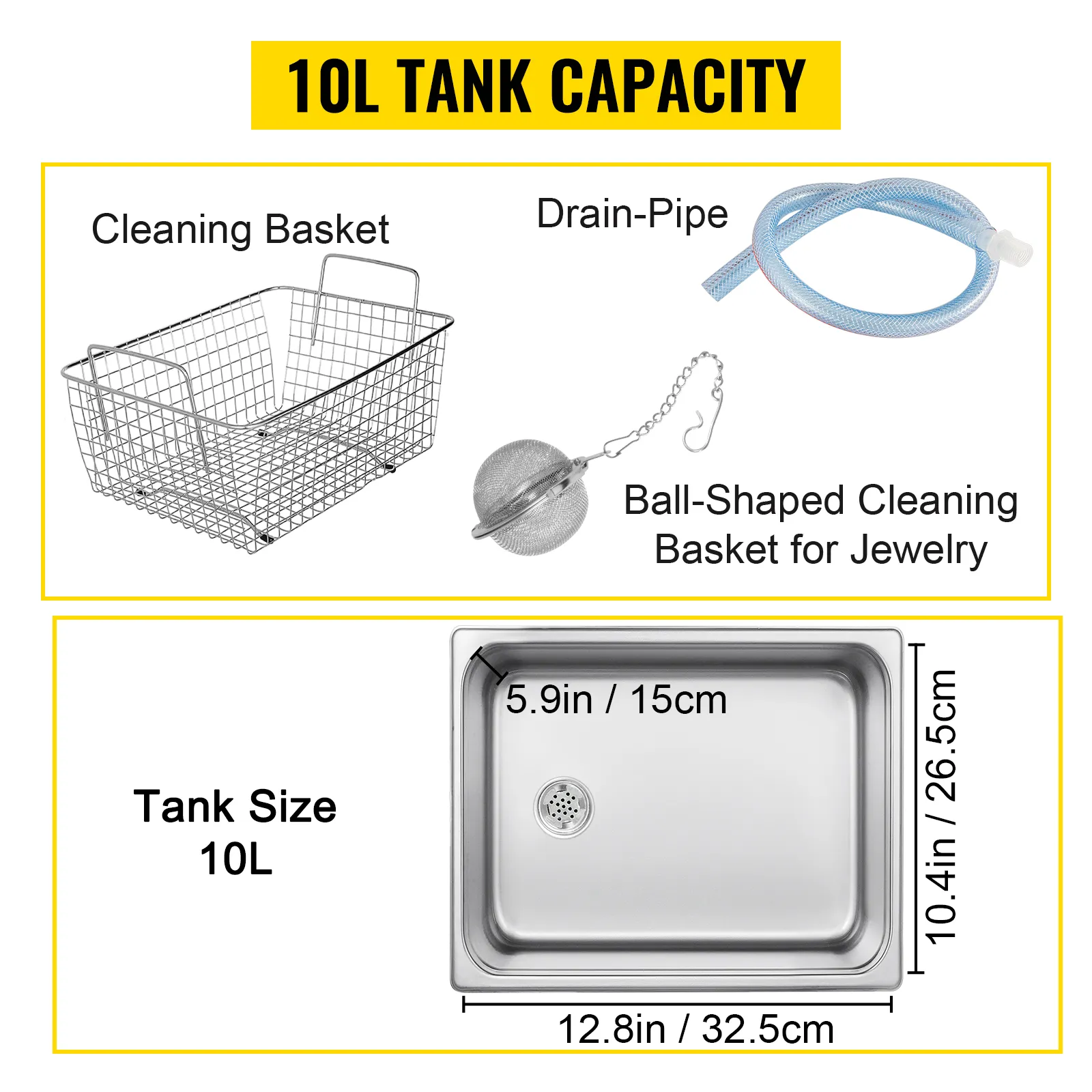 - Capacity: 9.6L-10L/2.5-2.6 Gal (Since the bottom of the ultrasonic cleaner is a curved surface, the actual volume will be smaller.)