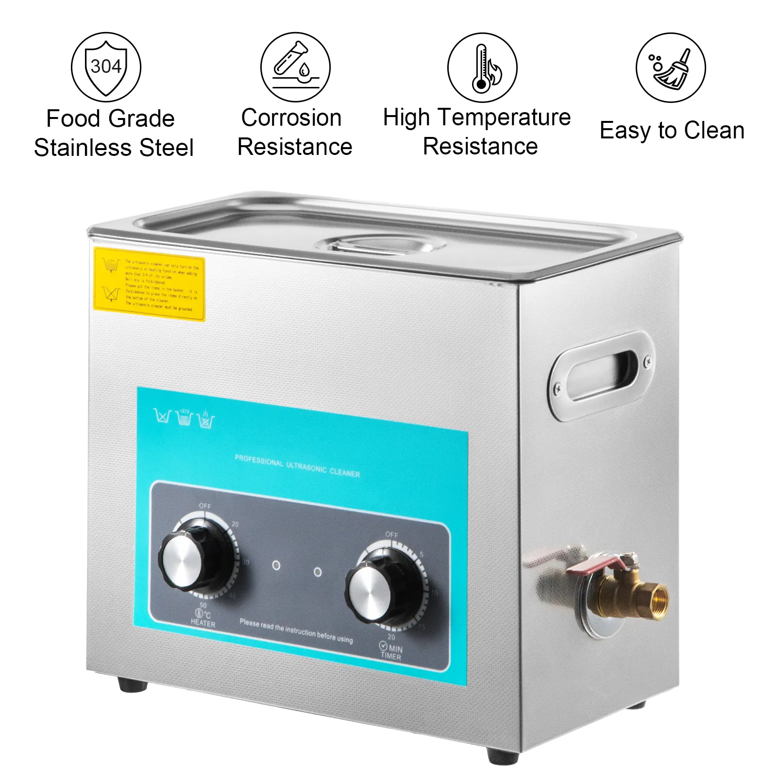 This ultrasonic parts cleaner is made from 304 stainless steel with a noise reduction lid and built-in handles on both sides, designed for durable use and easy cleaning.