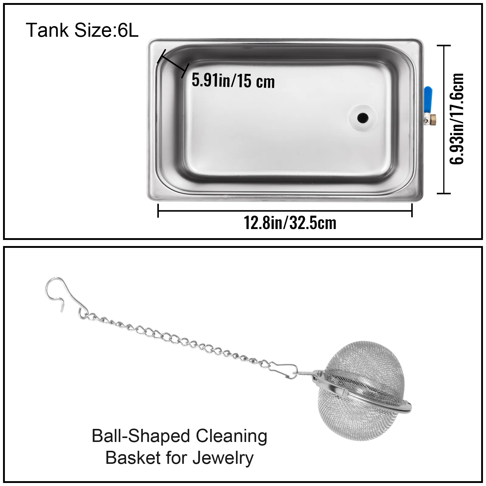 The sonic jewelry cleaner features a sizeable 6L/1.59 gal tank, coming with a jewelry cleaning ball to reduce friction and protect your valuables during washing.