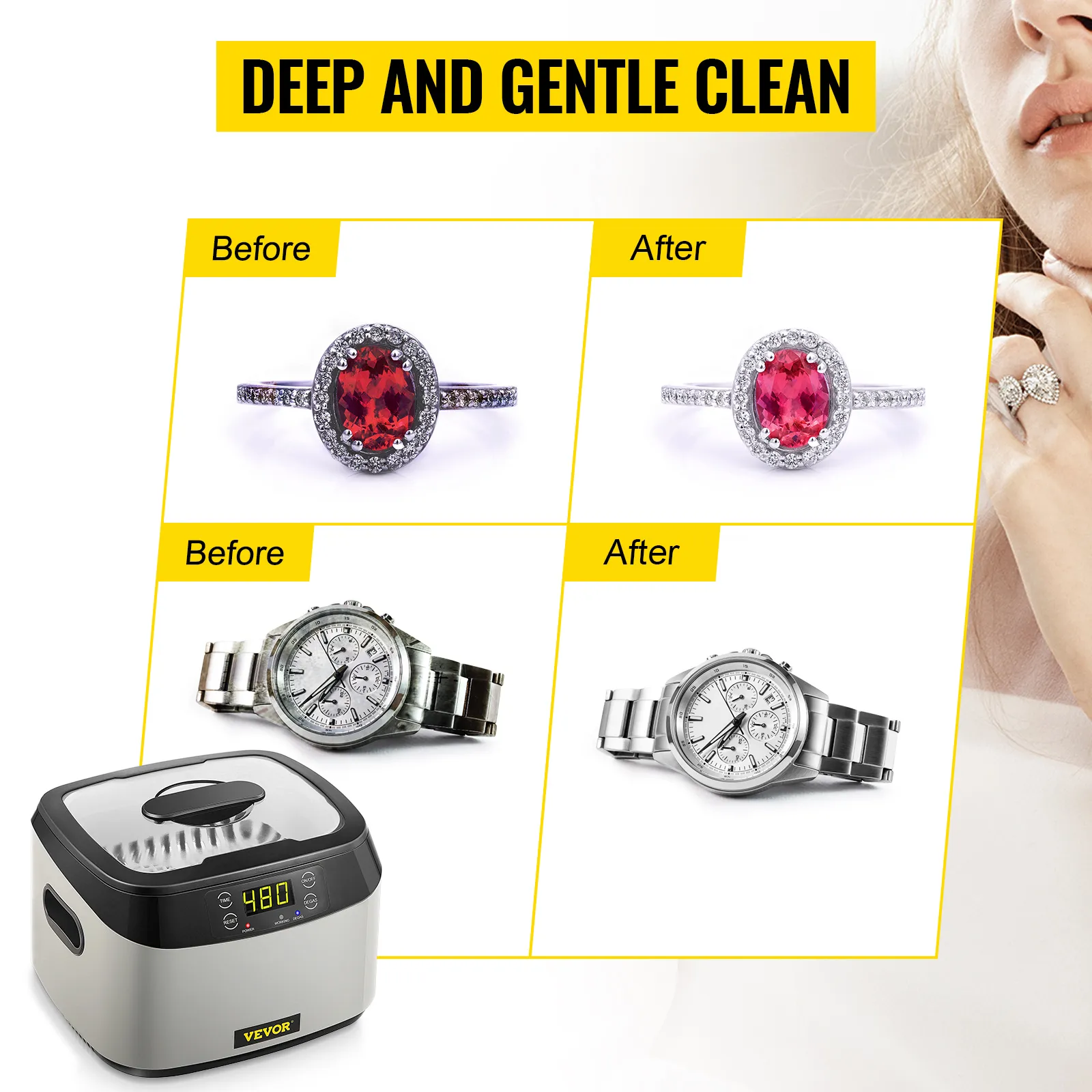This diamond cleaner for rings is built with sturdy 304 stainless steel and ABS plastic, making it an efficient machine for daily or professional cleaning work. Our ultrasonic jewelry cleaning machine will emit 40kHz ultrasonic waves to wash dirt on your valuables' surface and crevice deeply. With heating and timing functions, the professional jewelry cleaner machine is ideal for cleaning fruits, vegetables, jewelry, eyeglasses, watches, metal tools, etc.