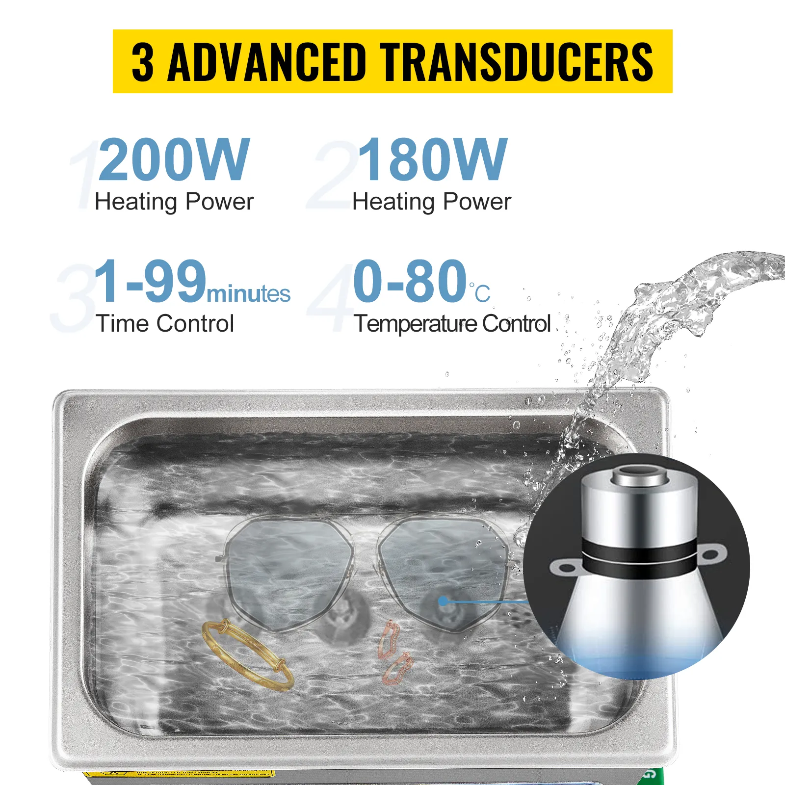 Heating power: 200W; Ultrasonic Power: 180W. Our ultrasound cleaning machine uses 3 advanced transducers to improve cleaning efficiency. It can remove stains on items in a few seconds without damaging the items.