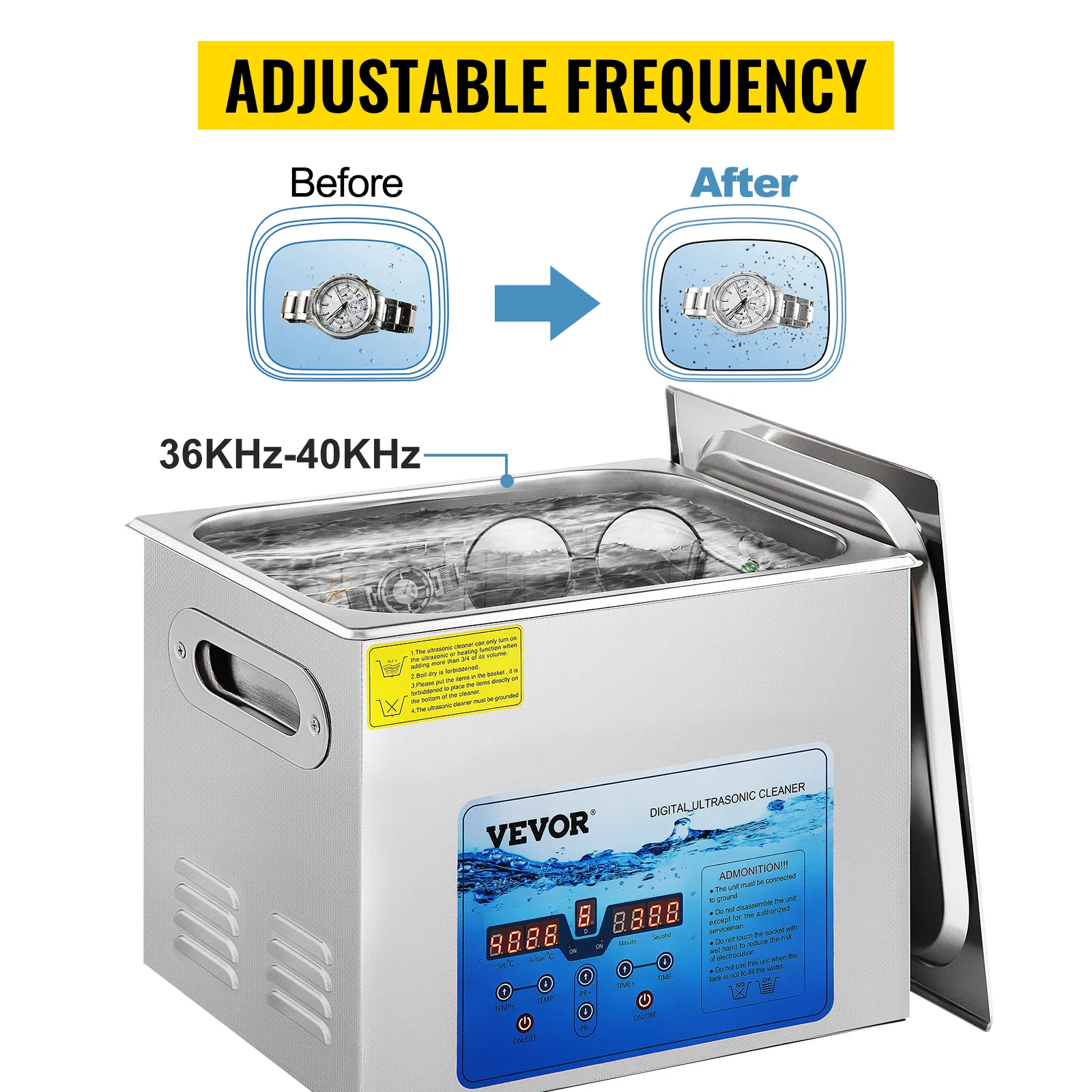 Adjustable frequency: 36KHz-40KHz. The ultrasonic cleaner machine generates 36khz-40khz ultrasonic waves to make your valuables and items sparkle again without any damage. The different ultrasonic frequency are suitable for cleaning different items.