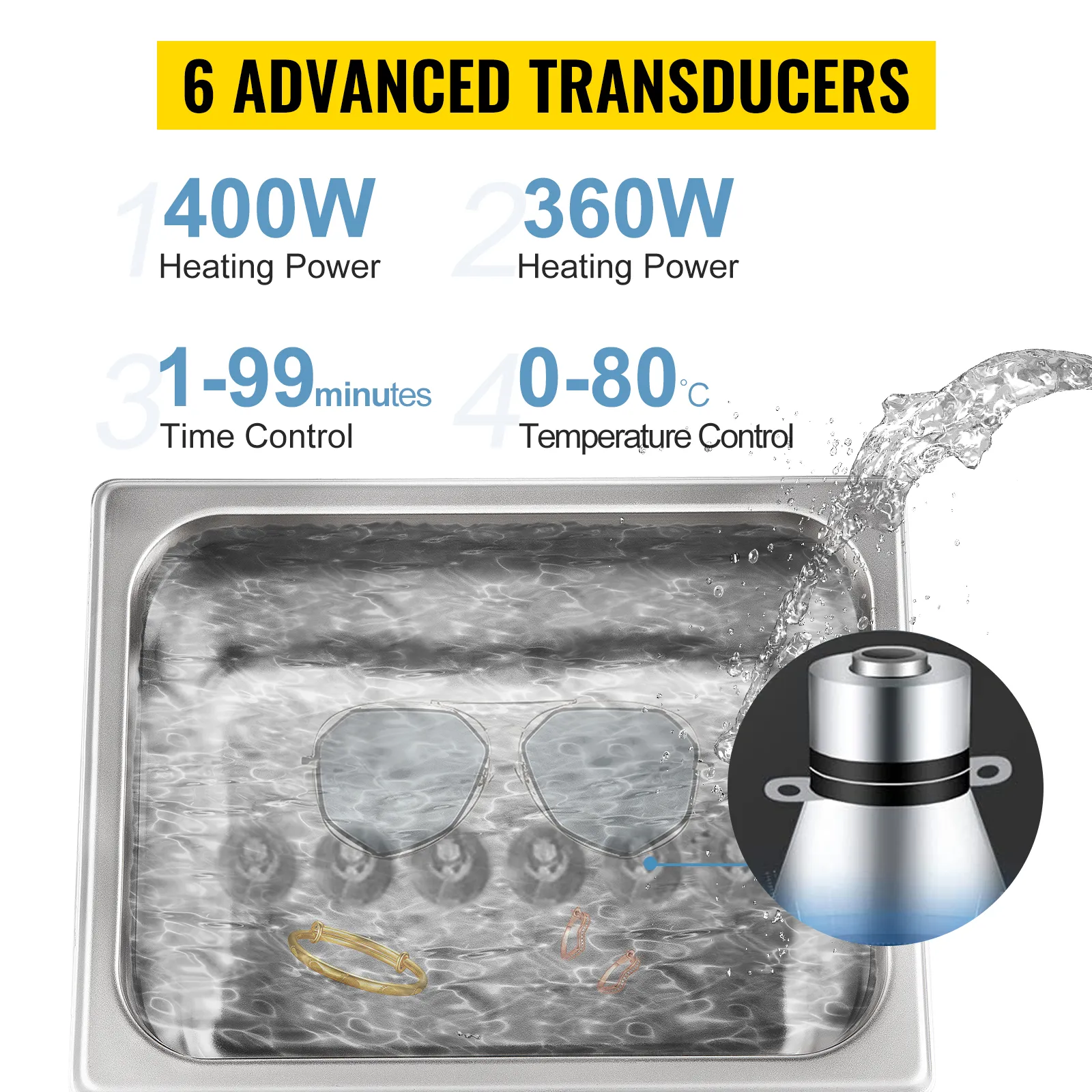 Heating power: 400W; Ultrasonic Power: 360W. Our ultrasound cleaning machine uses 6 advanced transducers to improve cleaning efficiency. It can remove stains on items in a few seconds without damaging the items.