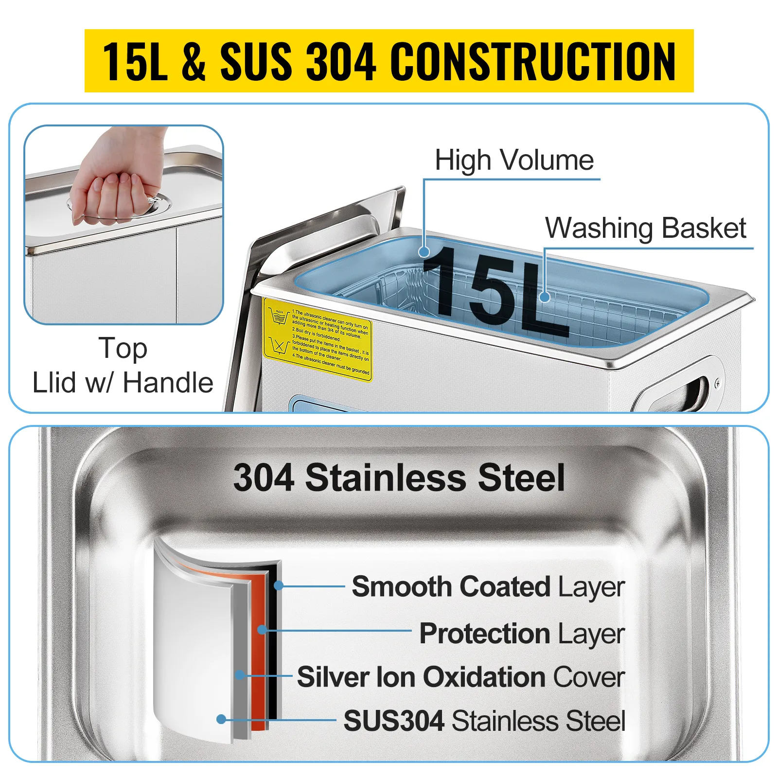 This ultrasonic parts cleaner is made of corrosion protection and rust-free 304 stainless steel, durable enough to last for years. The 4 gal/15 L tank is large enough to hold your jewelry, glasses, watches, or dentures. Comes with a noise-reducing top lid, and a washing basket for cleaning objects which need less friction.