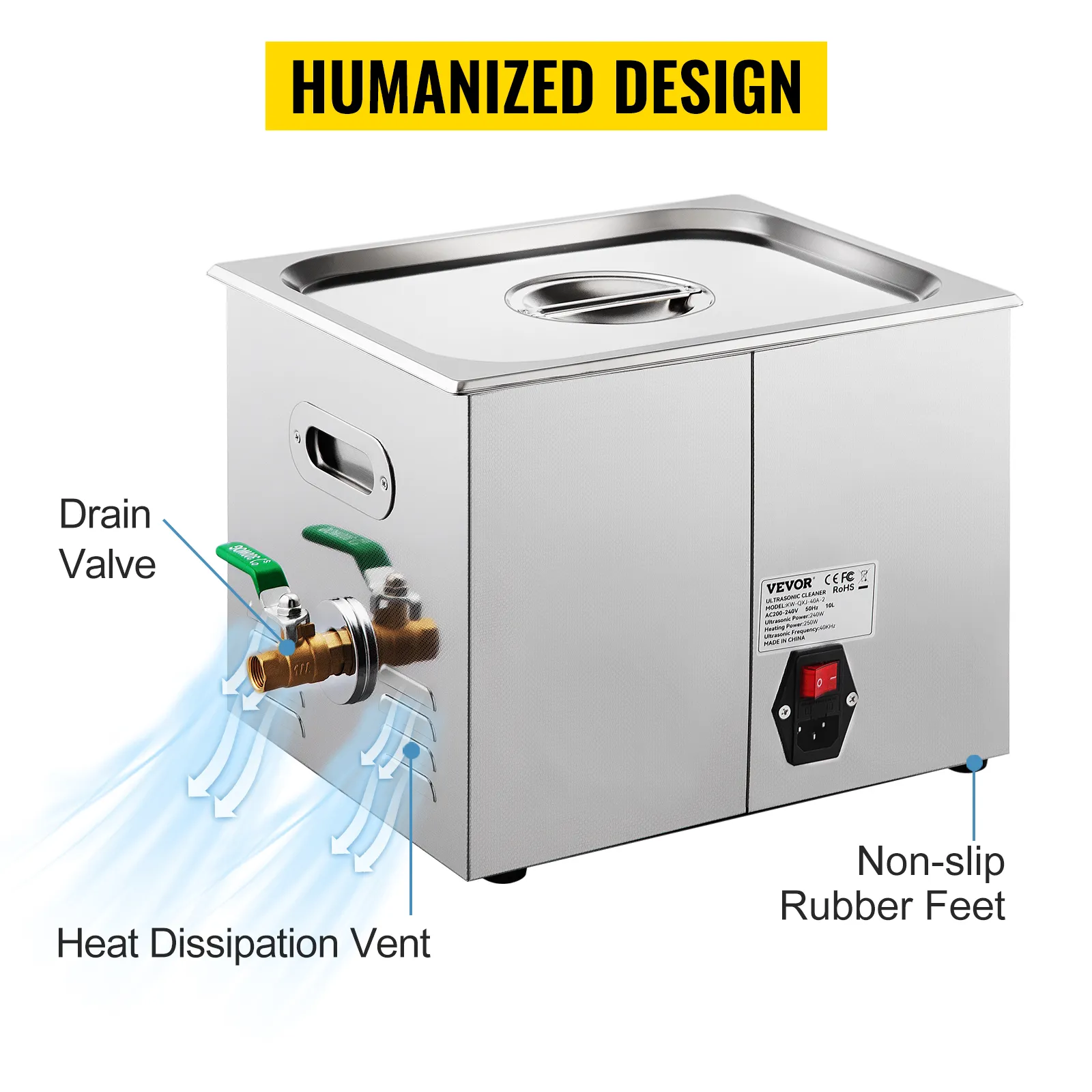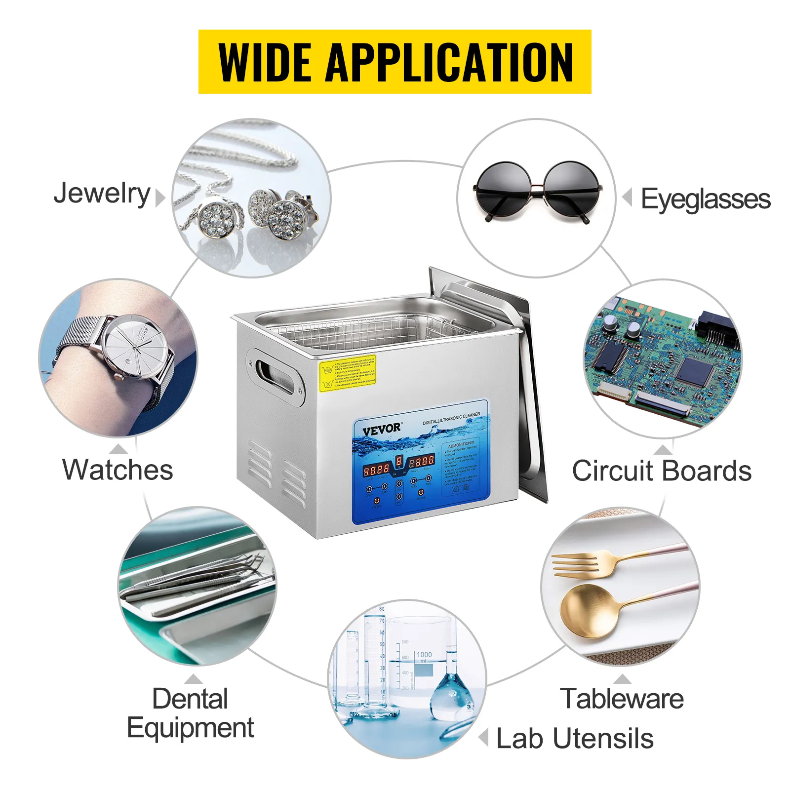- The VEVOR’s sonic cleaners feature adjustable frequency, time, and temperature to meet your various cleaning needs. The premium 304 stainless steel and complete accessories provide you with long service life and maximum convenience. The design of the heat dissipation vent, non-slip rubber feet, and drain valve make the jewelry cleaning machine smoothly and securely operation without any damage. In addition, our products got the FCC/CE/RoHS Certificates. The professional ultrasonic jewelry cleaner is an optimal solution for lab, home, commerce, industry, factory, and so on.