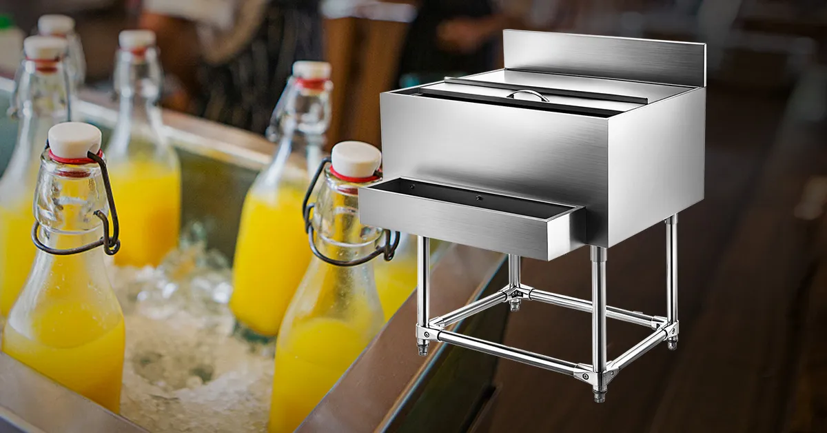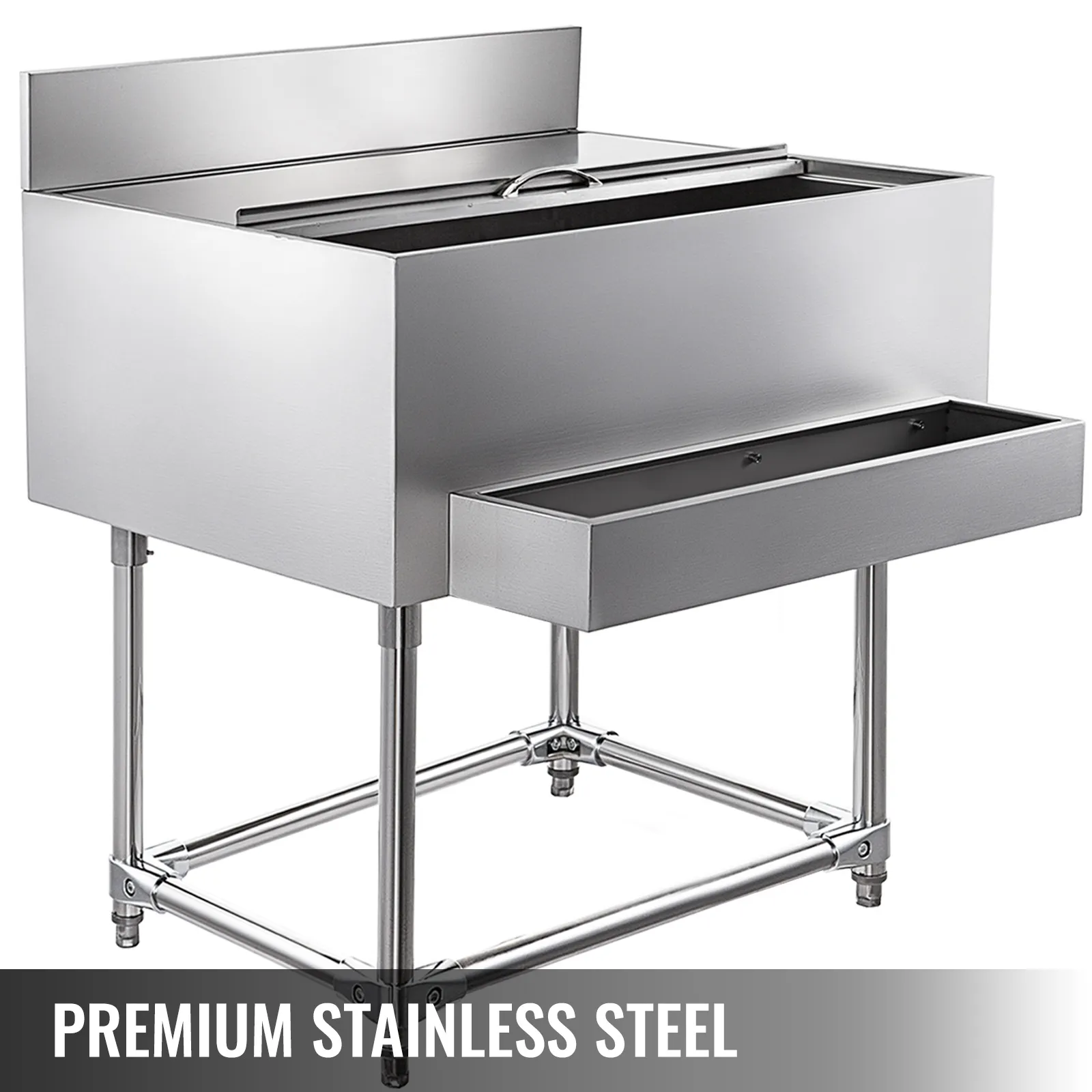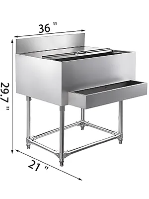 Premium underbar ice bin with 304 stainless steel material(except the legs), which increases durability and ensures corrosion resistance. Large container with 264 lbs ice capacity, able to hold most wine bottles. There is a drain hole in the bottom and equipped with a drain valve to remove water. A sliding cover included for quick drink access, protect the inner ice from contamination. Keep wine in good taste and fresh, let you have cold drinks at hand. Perfect choice for bars and pubs. It also can be used for outdoor kitchen, party, resort, etc.