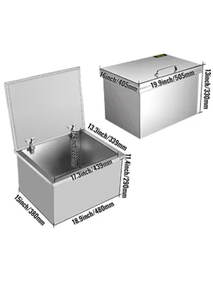 Product Dimension: 19.9 x 16 x 13 inch; Cutout Dimension: 18.9 x 15 x 11.4 inch; Inner Dimension: 17.3 x 13.3 x 11.4 inch. Adopts space-saving drop-in design, the interior of our stainless steel ice chest has a large capacity.