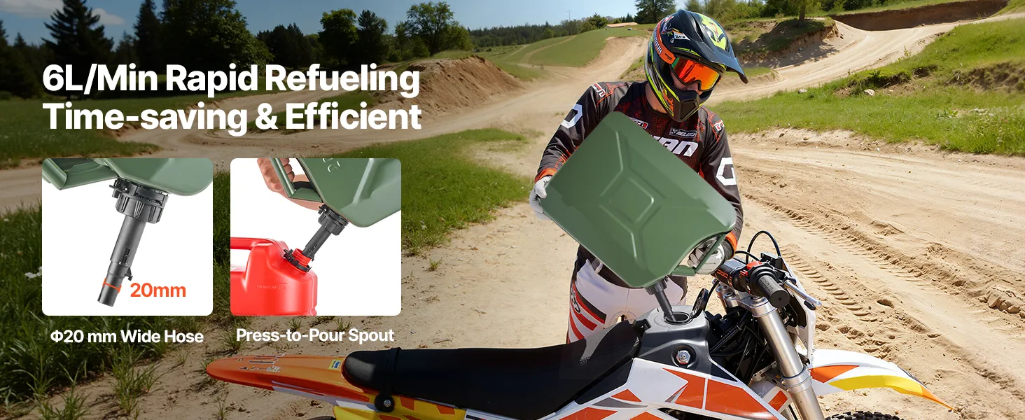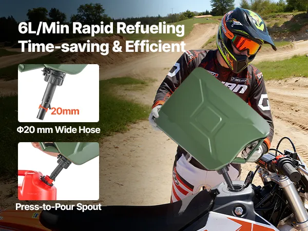 Smooth 6 L/min Fast Flow: Hate slow, messy refills? This metal jerry can delivers up to 6 L/min with a wide 20 mm hose and snap spout, giving you smooth, splash-free pours without the annoying "glug"