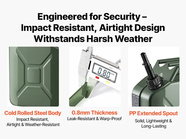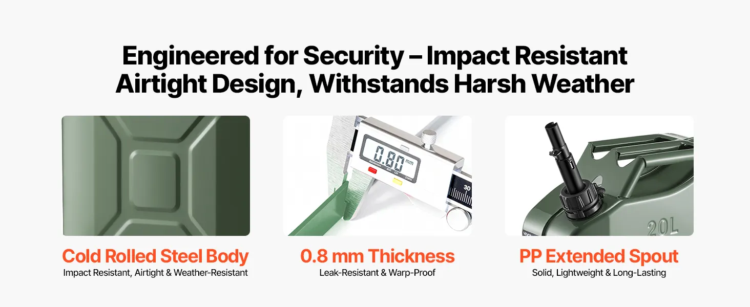 Military-Style Durable Build: Looking for tough? This fuel jerry can uses 0.8 mm cold-rolled steel that withstands drops, bumps, and sun. A PP extension spout makes every refill easy and clean